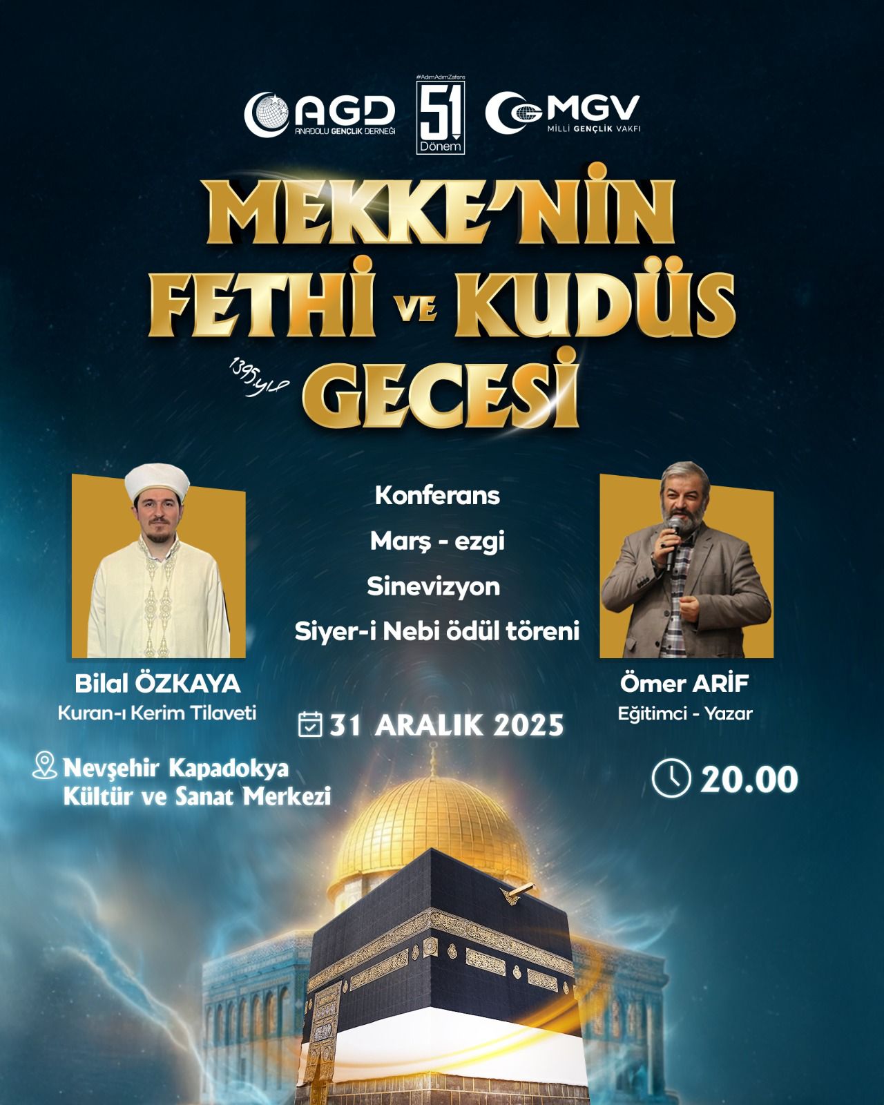 Anadolu Gençlik Derneği (AGD) ve Milli Gençlik Vakfı (MGV) tarafından geleneksel olarak düzenlenen “Mekke’nin Fethi ve Kudüs Gecesi” programı, bu yıl 51. dönem kapsamında Nevşehir’de gerçekleştirilecek.