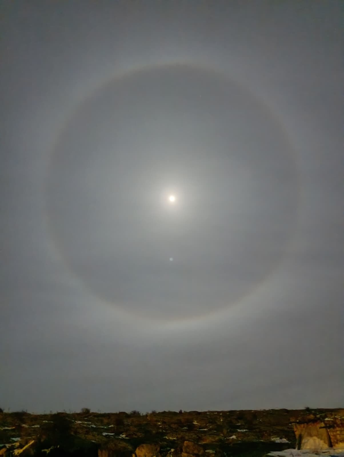Nevşehir’de akşam saat: 22.55 sularında gökyüzünde oluşan nadir görülen ay halesi, vatandaşların ilgisini çekti. Havanın kararmasının ardından ayın etrafında beliren ışıklı çember, ortaya kartpostallık görüntüler çıkardı.