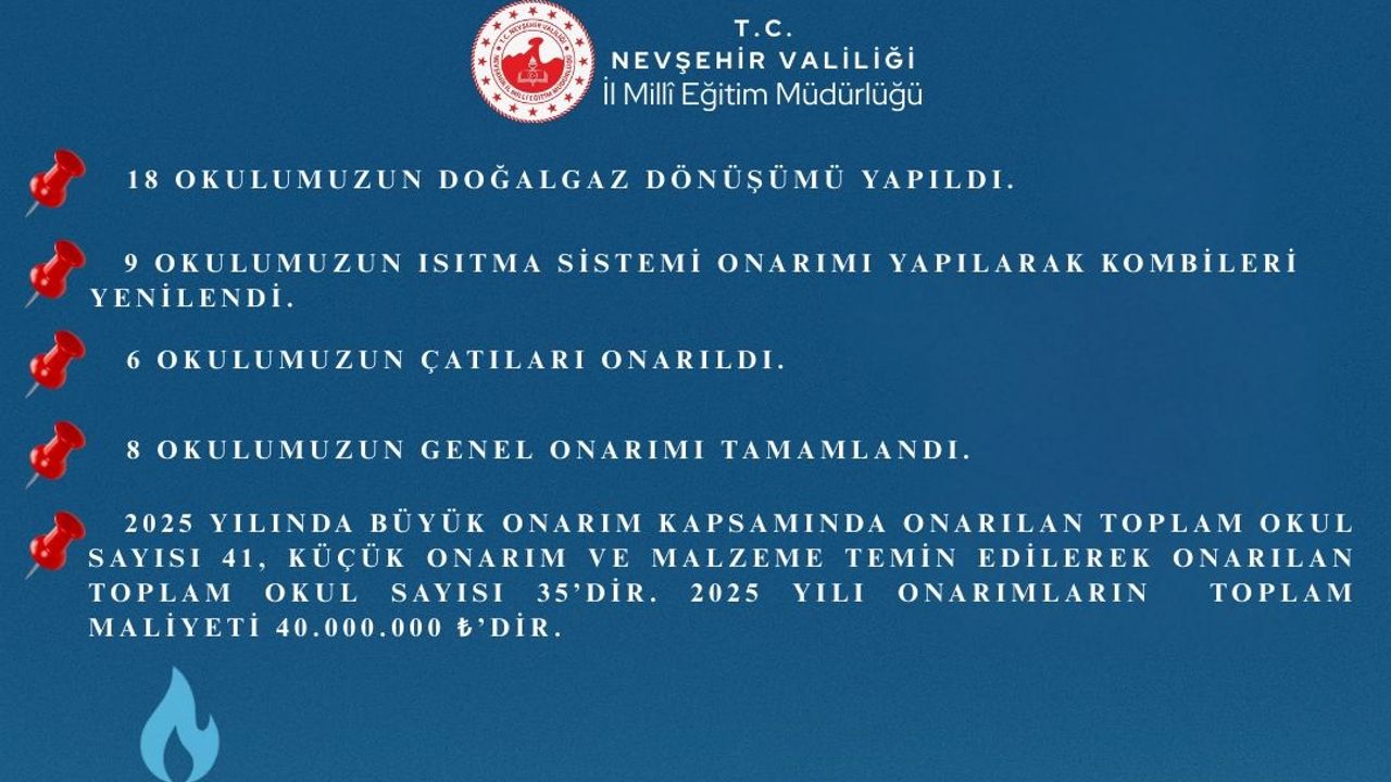 2025 yılında büyük onarım kapsamında onarılan toplam okul sayısı 41, küçük onarım ve malzeme temin edilerek onarılan toplam okul sayısı 35’dir. 2025 yılı onarımların toplam maliyeti 40.000.000₺’dir. Millî Eğitim Bakanlığı önderliğinde İl Millî Eğitim Müdürlüğü tarafından, eğitim kurumlarının fiziki şartlarını güçlendirmek adına tüm süreçler yakından takip ediliyor ve geleceğe daha da güçlü okullar hazırlanmaya devam ediliyor.