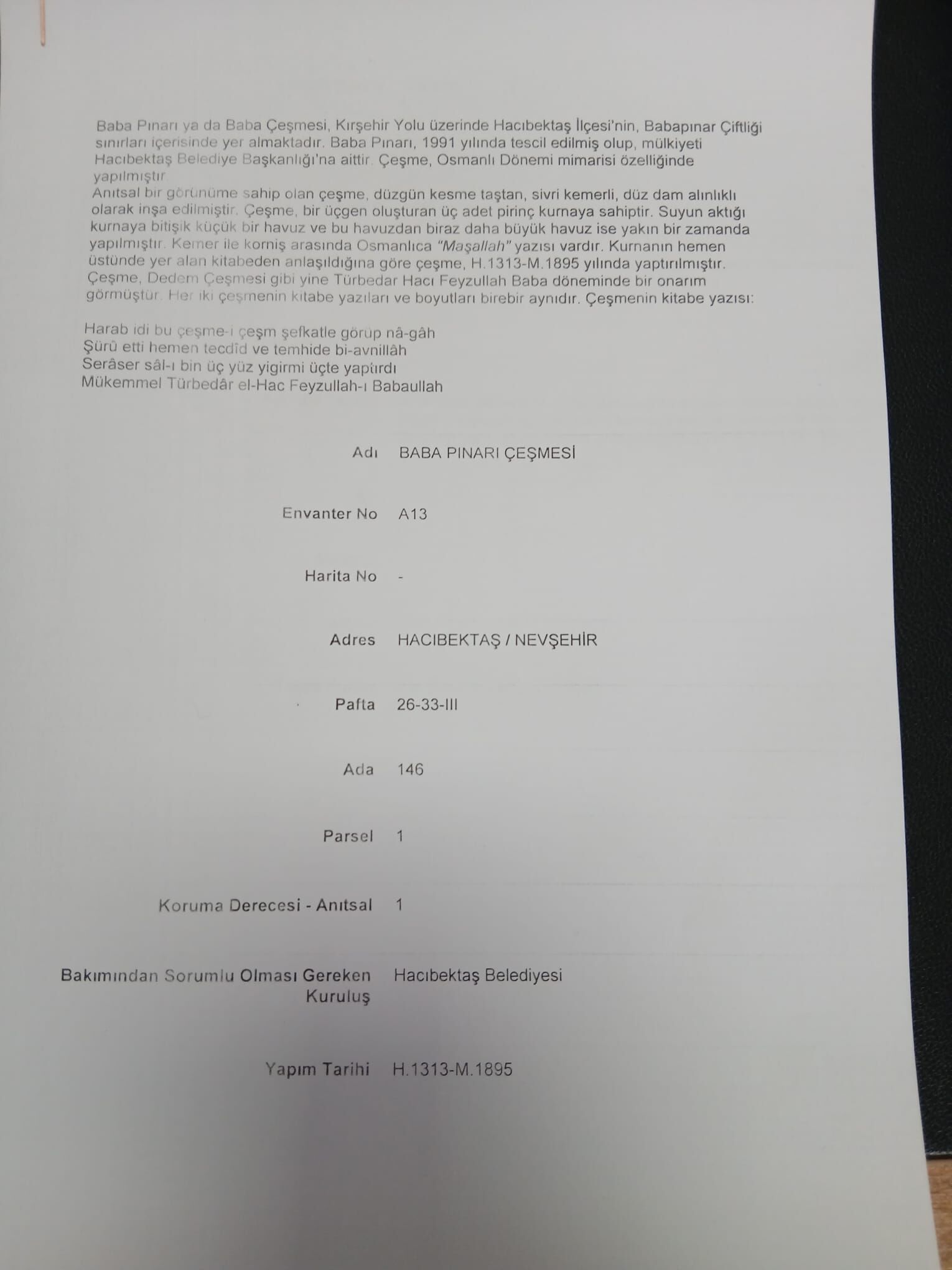 Hicri 1313 (Miladi 1895) yılında inşa edilen çeşme, 08.02.1991 tarih ve 949 sayılı Kültür ve Tabiat Varlıklarını Koruma Kurulu kararıyla tescil edilerek koruma altına alındı. Envanter No: A13 olarak kayıtlarda yer alan ve mülkiyeti Hacıbektaş Belediyesi’ne ait olan yapı, “Anıtsal 1. derece” koruma statüsünde bulunuyor.