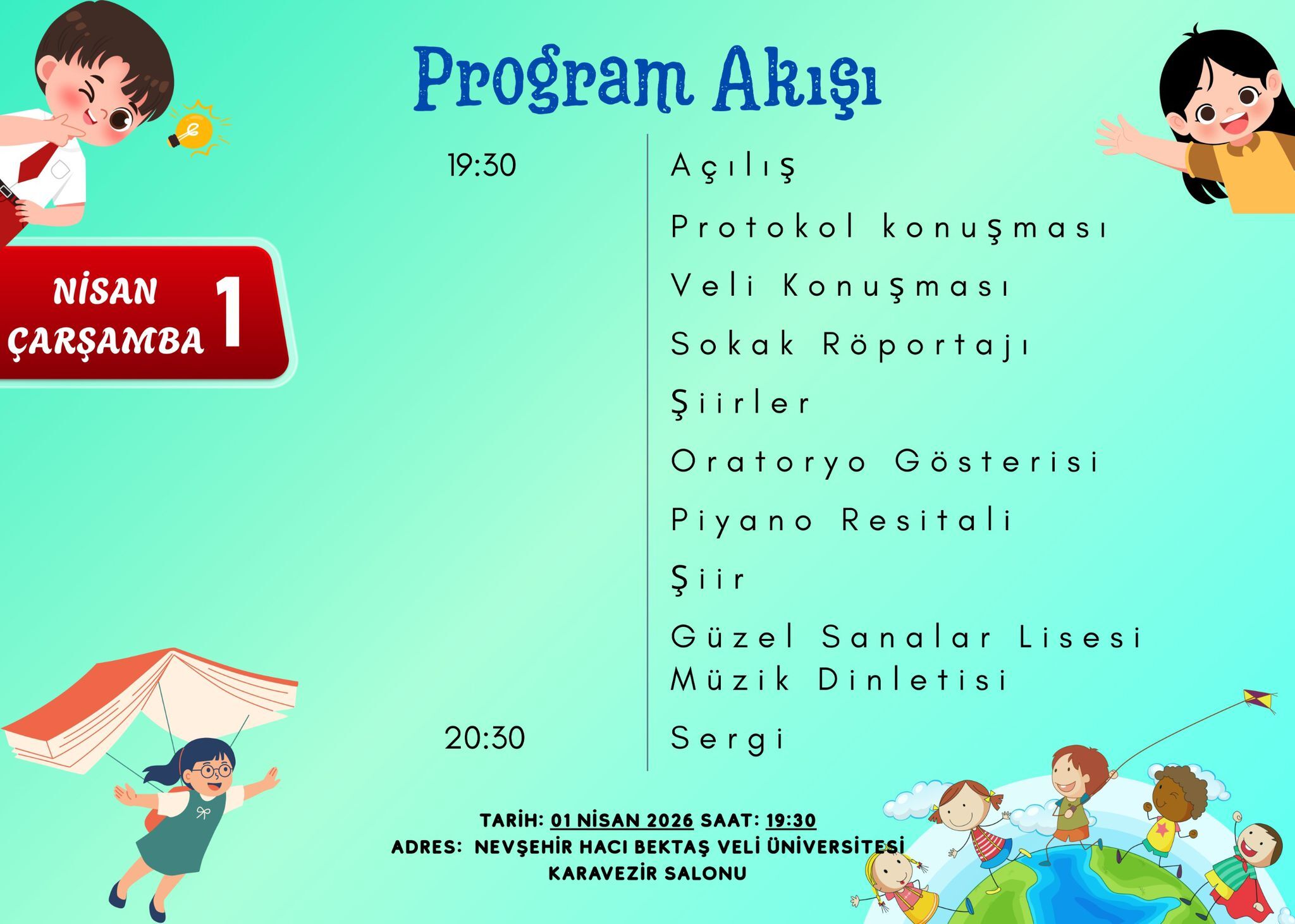 Program, 1 Nisan 2026 Çarşamba günü saat 19:30’da Hacıbektaşi Veli Üniversitesi Karavezir Salonu’nda gerçekleştirilecek. Etkinlik kapsamında; açılış konuşmaları, protokol ve veli konuşmaları, sokak röportajları ve şiir dinletileri yapılacak. Ayrıca, oratoryo gösterisi, piyano resitali ve Güzel Sanatlar Lisesi müzik dinletisi gibi sanat performansları izleyicilerle buluşacak. Etkinlik sonunda özel eğitim öğrencilerinin eserlerinden oluşan sergi de ziyaretçilere sunulacak.