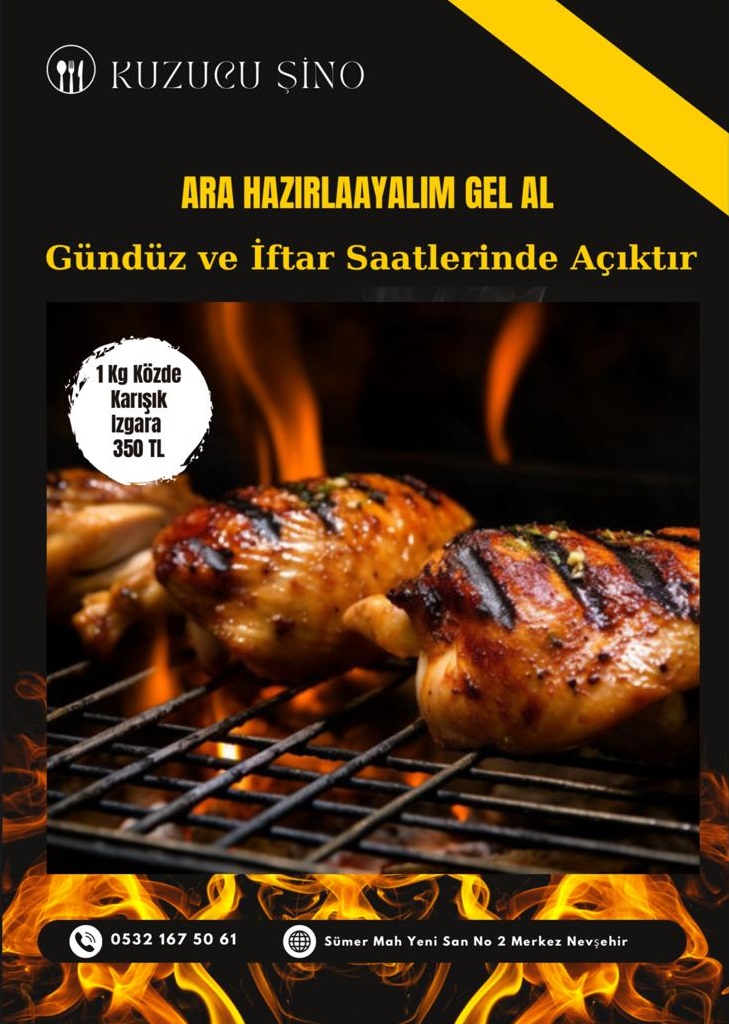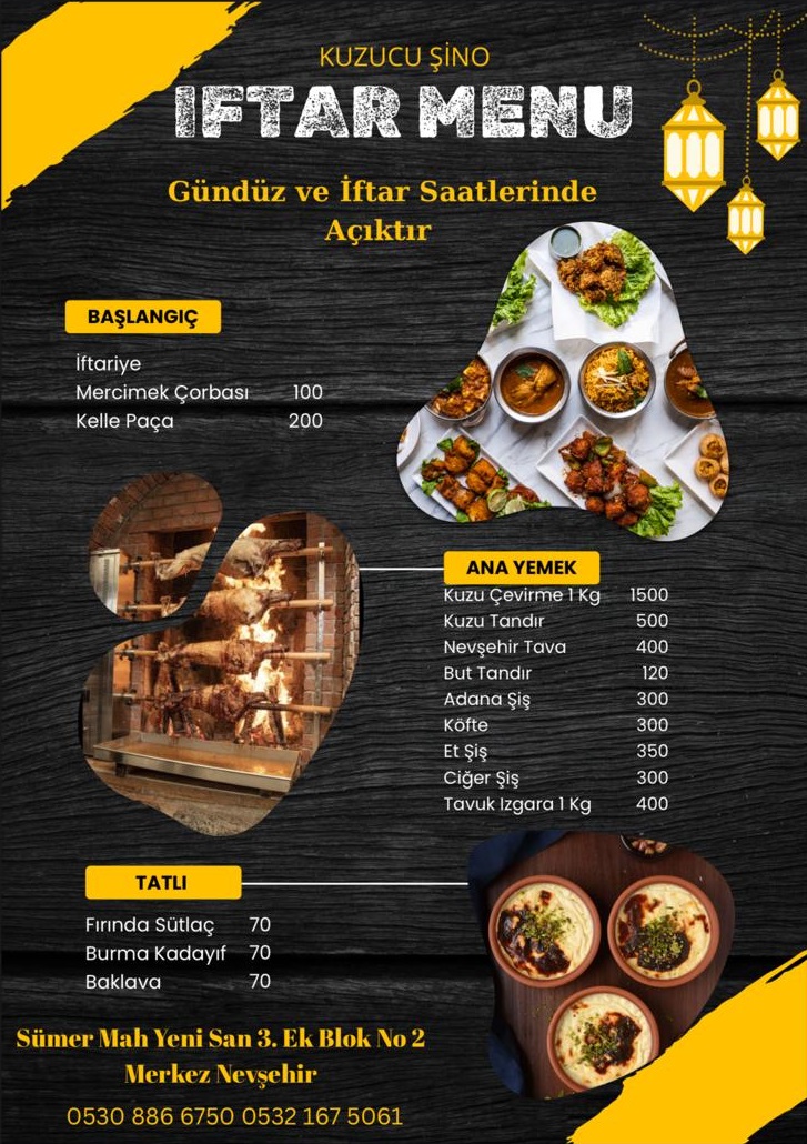 Nevşehir merkezde hizmet veren KUZUCU ŞİNO, açıldığı günden bu yana uygun fiyatlı ve kaliteli yemekleriyle adından söz ettiriyor. Ramazan ayı için özel olarak hazırlanan menüde, geleneksel Türk mutfağının sevilen lezzetleri bir araya geliyor. İşletme, Ramazan ayı boyunca hem gündüz saatlerinde hem de iftar vakitlerinde açık olacak.