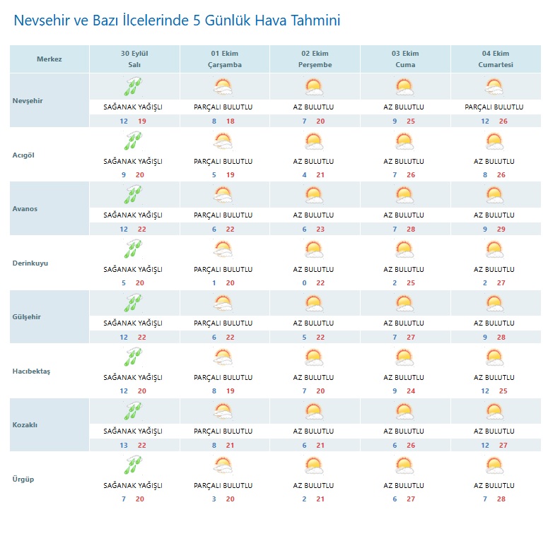 Merkez: Nevşehir’de 30 Eylül Salı günü sağanak yağış bekleniyor. 1 Ekim Çarşamba ise parçalı bulutlu bir hava hakim olacak. Perşembe ve Cuma günleri az bulutlu hava görülecek, Cumartesi ise tekrar parçalı bulutlu olacak. Sıcaklıklar en düşük 7, en yüksek 26 derece arasında değişecek.