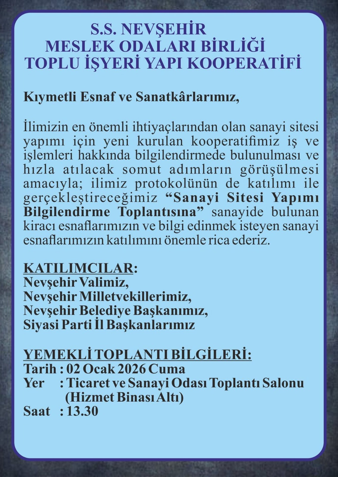 Nevşehir’de uzun süredir ihtiyaç duyulan sanayi sitesi yapımı için önemli bir adım atılıyor. Bu kapsamda, yeni kurulan sanayi sitesi kooperatifinin yürüttüğü iş ve işlemler hakkında esnaf ve sanatkârların bilgilendirilmesi ve sürecin hızlandırılması amacıyla “Sanayi Sitesi Yapımı Bilgilendirme Toplantısı” düzenlenecek.
