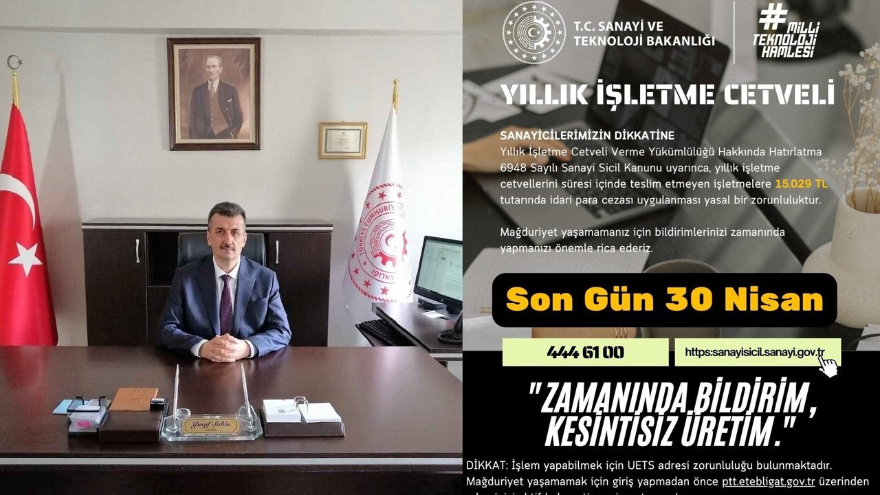 Nevşehir İl Sanayi ve Teknoloji Müdürü Yusuf ŞAHİN tarafından yapılan açıklamada; “Sanayi Sicil Bilgi Sistemine kayıtlı işletmelerin ‘Yıllık İşletme Cetveli’ giriş işlemlerini tamamlamaları için 10 (on) gün kaldığı ifade edilerek, 20.04.2026 tarihi itibarıyla ilimizde Sanayi Sicil Bilgi Sistemine kayıtlı 879 işletmeden sadece 269 işletmenin yıllık işletme cetveli girişi yaptığı, kalan 610 işletmenin de son güne bırakmadan bir an önce yıllık işletme cetveli giriş işlemlerini gerçekleştirmeleri gerektiğini” ifade etti. İl Müdürü ŞAHİN açıklamalarının devamında ise;