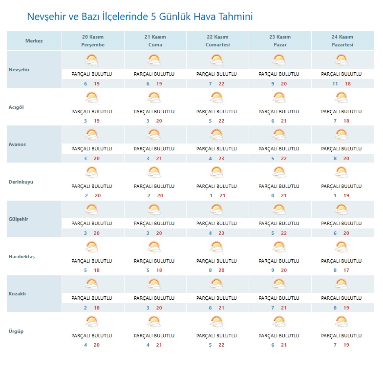 | Nevşehir (Merkez) | 6 / 19 °C — Parçalı bulutlu | 6 / 19 °C — Parçalı bulutlu | 7 / 22 °C — Parçalı bulutlu | 9 / 20 °C — Parçalı bulutlu | 11 / 18 °C — Parçalı bulutlu |