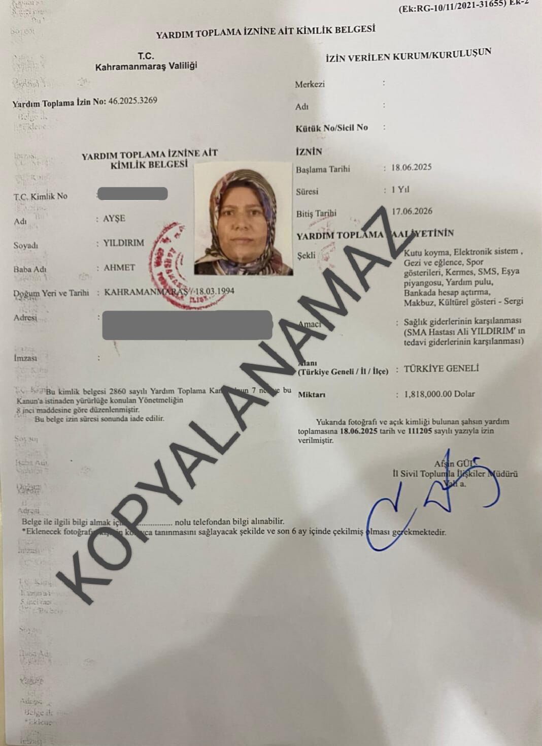 Ali bebek için yürütülen yardım kampanyası, Kahramanmaraş Valiliği izniyle sürdürülüyor. Yapılacak tüm bağışlar, Ali’nin yurt dışındaki gen tedavisine ulaşması amacıyla kullanılacak.