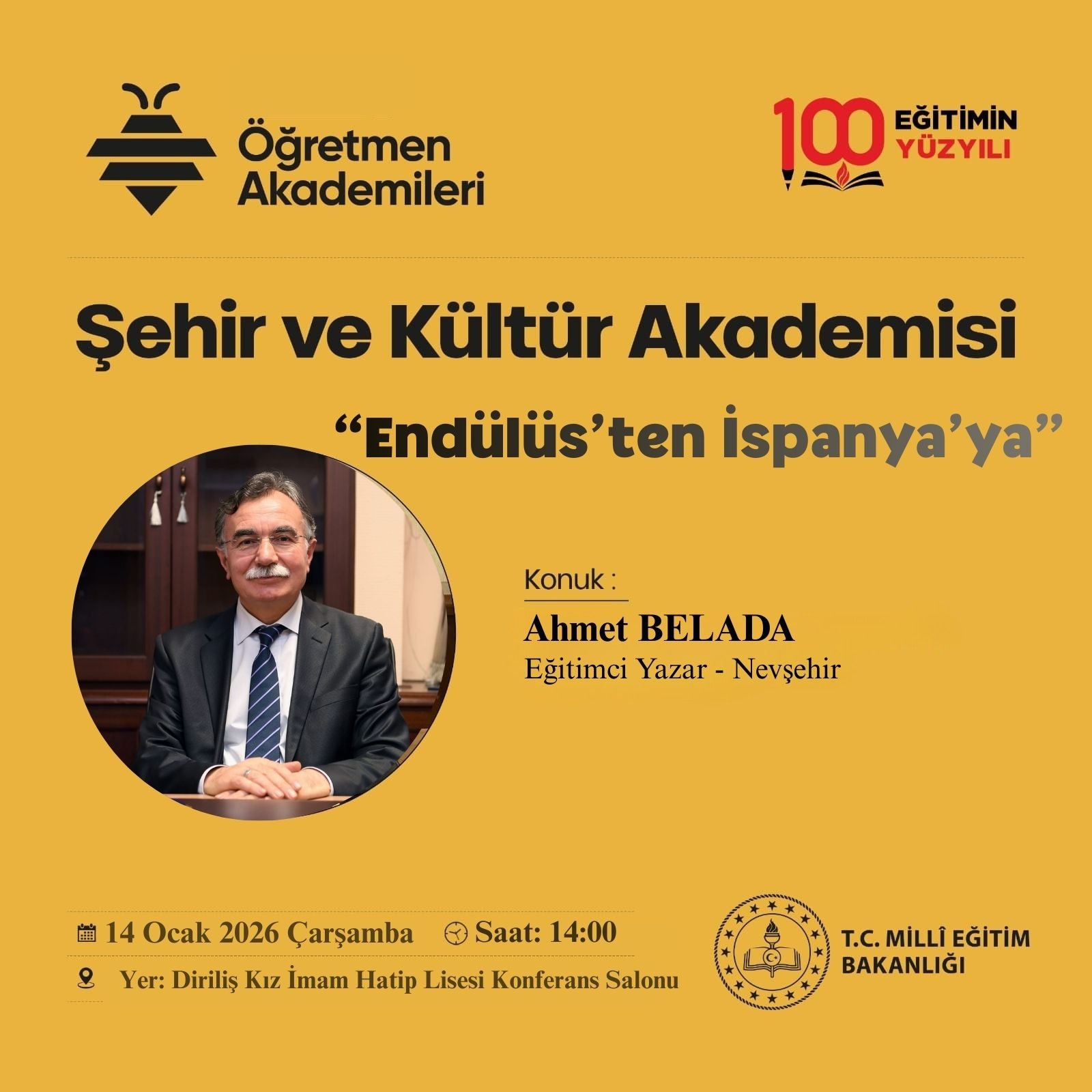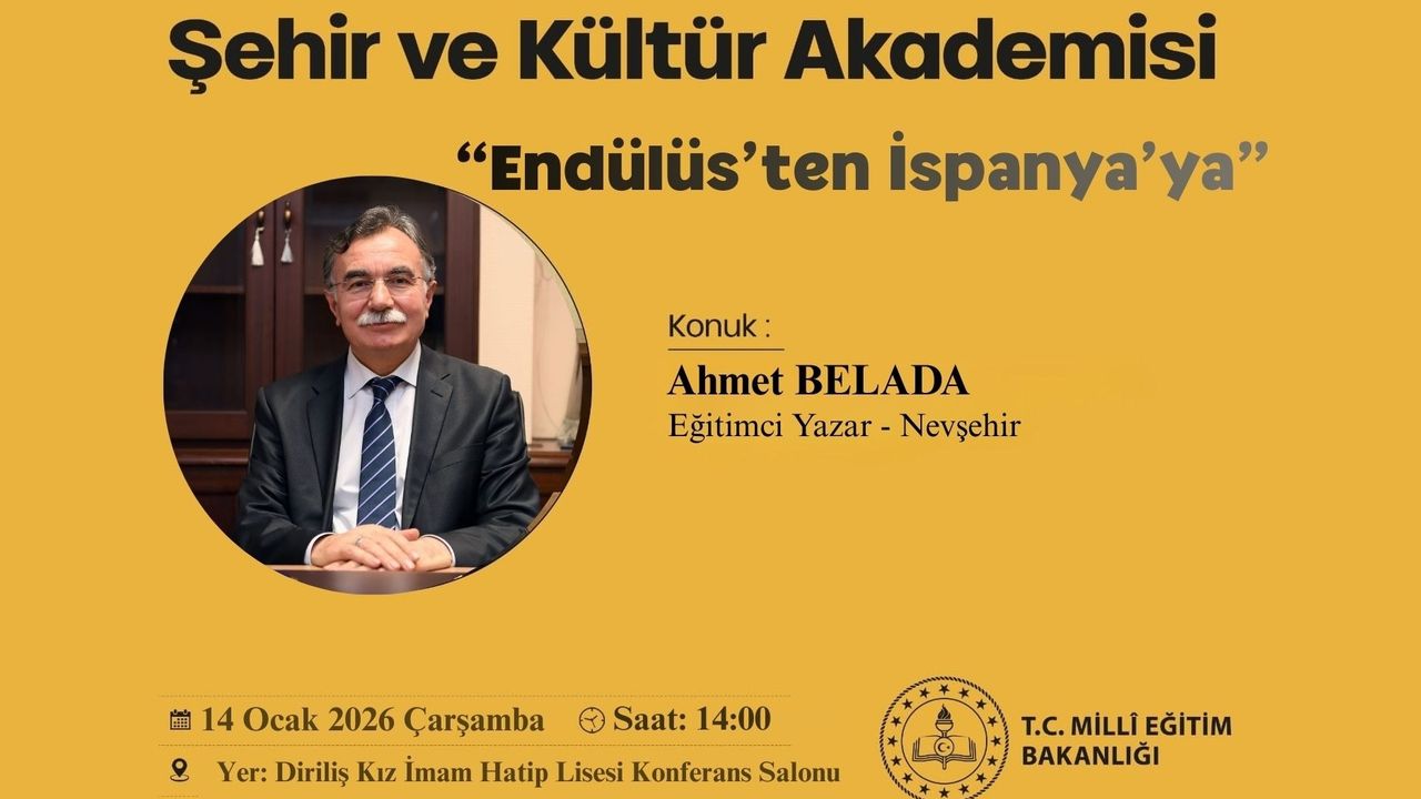 “Endülüs’ten İspanya’ya” başlığıyla planlanan programın konuk konuşmacısı eğitimci ve yazar Ahmet Belada olacak. Etkinlik, 14 Ocak 2026 Çarşamba günü saat 14.00’te, Diriliş Kız İmam Hatip Lisesi Konferans Salonu’nda gerçekleştirilecek.