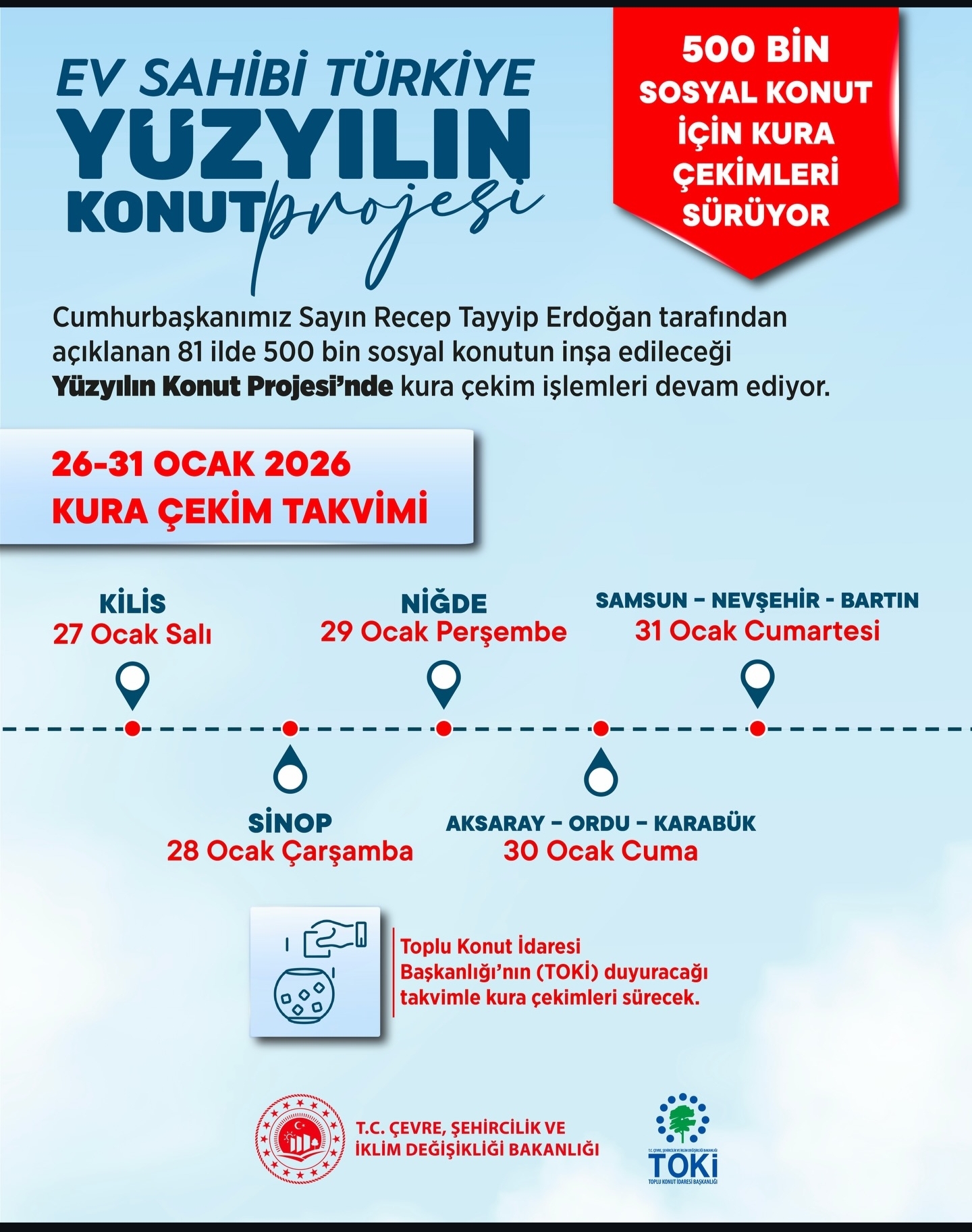 31 Ocak 2026 Cumartesi günü gerçekleştirilecek kura çekimi ile hak sahibi olmaya hak kazanan vatandaşlar, TOKİ’nin resmi kanalları üzerinden duyurulacak sonuçları takip edebilecek.