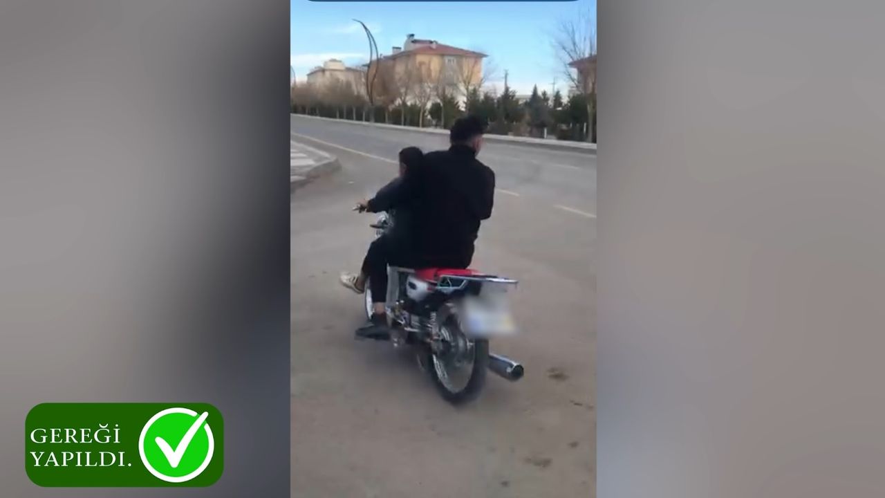 Yapılan incelemelerde, söz konusu motosikletin 50… plakalı olduğu ve sürücüsünün C.Y. isimli şahıs olduğu belirlendi. Trafik Jandarması timlerince yapılan kontroller sonucunda, sürücüye 2918 sayılı Karayolları Trafik Kanunu kapsamında motosikletle akrobatik hareketler yapmak ve diğer kural ihlalleri nedeniyle idari para cezası uygulandı.