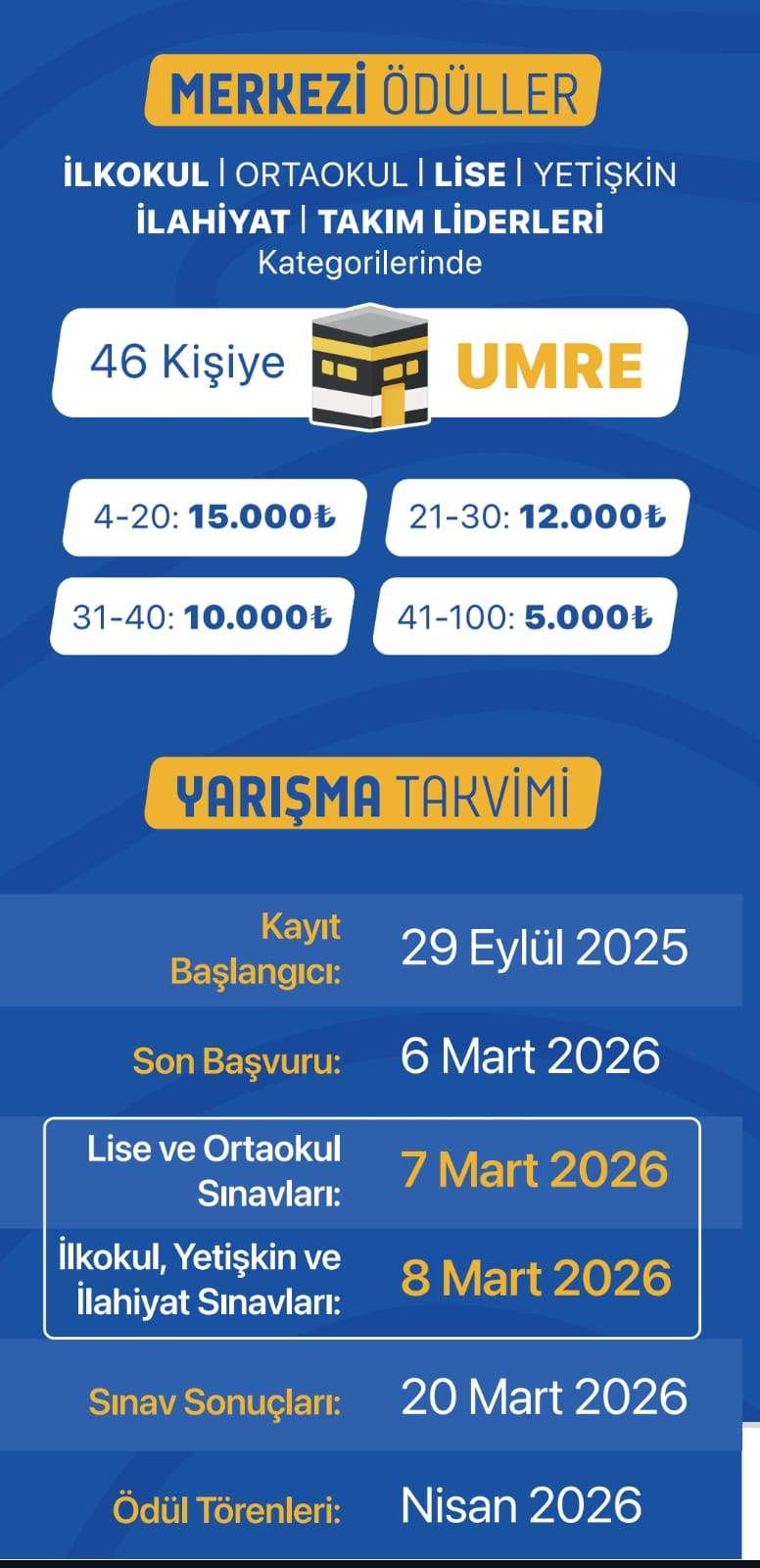 07-08 Mart 2026 tarihlerinde tek aşamada çoktan seçmeli olarak gerçekleştirilecek olan yarışmada, sıralama tek bir sınavın sonuçlarına göre yapılacak ve bu sıralamada dereceye girenlere çeşitli ödüllerin yanı sıra 46 kişiye de umre ödülü verilecek.