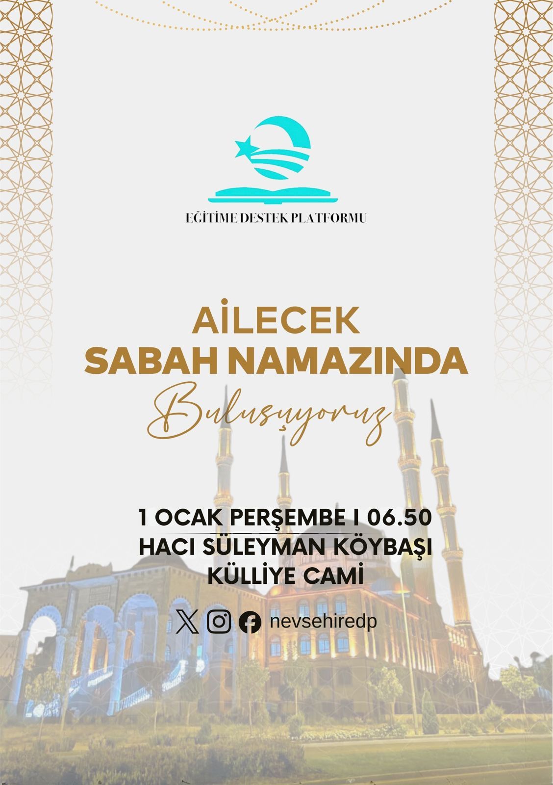 Nevşehir Eğitim Destek Platformu, yeni yılı manevi bir atmosferde karşılamak isteyen aileleri ve vatandaşları anlamlı bir buluşmaya davet ediyor. Platform tarafından düzenlenen program kapsamında, 1 Ocak 2026 Perşembe günü sabah namazında vatandaşlar bir araya gelecek.