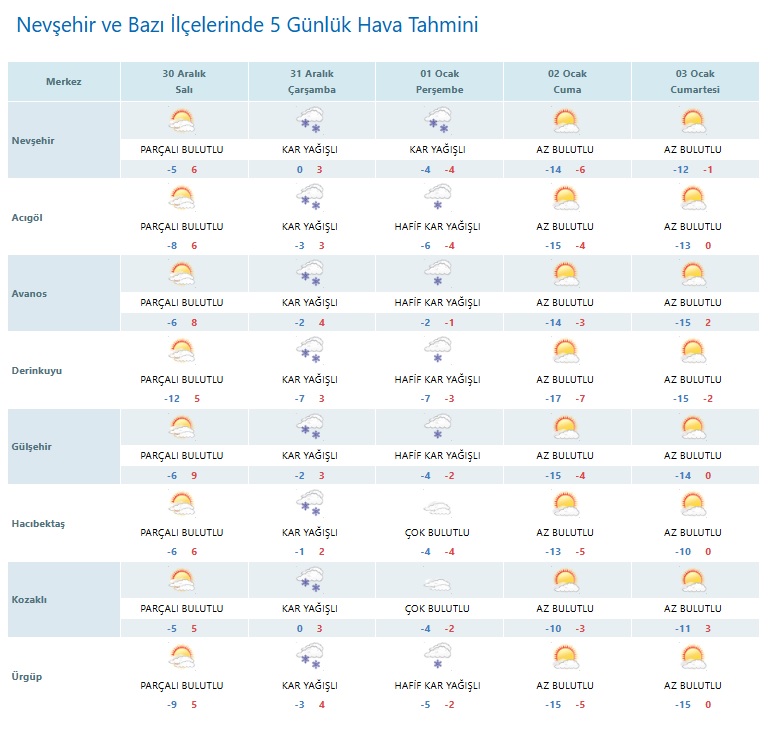 Meteoroloji verilerine göre Nevşehir ve ilçelerinde önümüzdeki 5 gün boyunca kar yağışı ve dondurucu soğuk hava etkili olacak. Özellikle 31 Aralık Salı ve 1 Ocak Çarşamba günleri il genelinde kar yağışı beklenirken, yeni yılın ilk günleriyle birlikte hava sıcaklıkları sert şekilde düşecek.