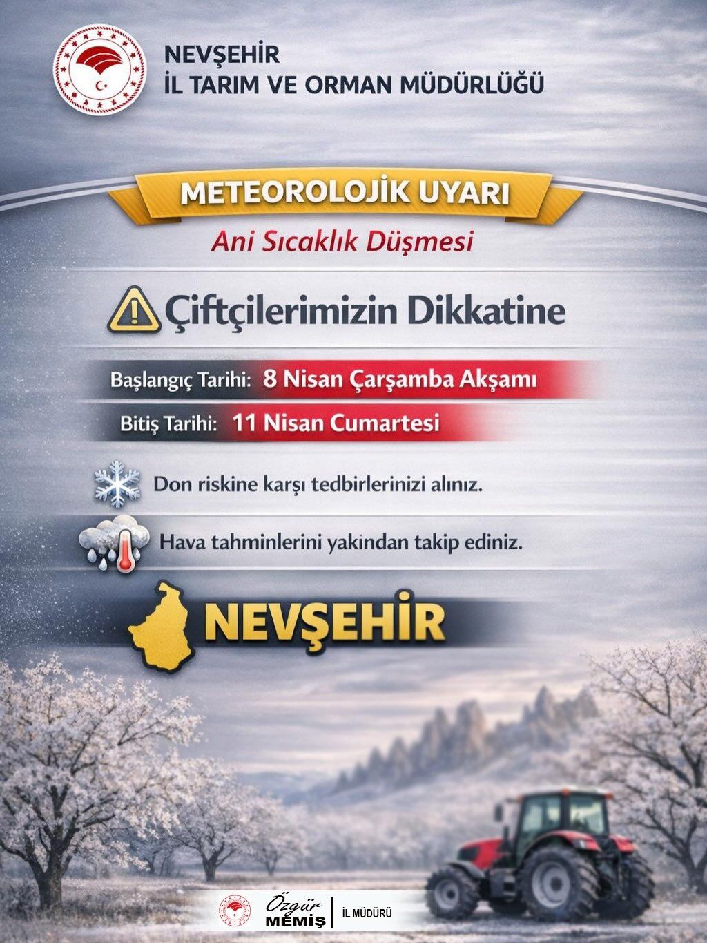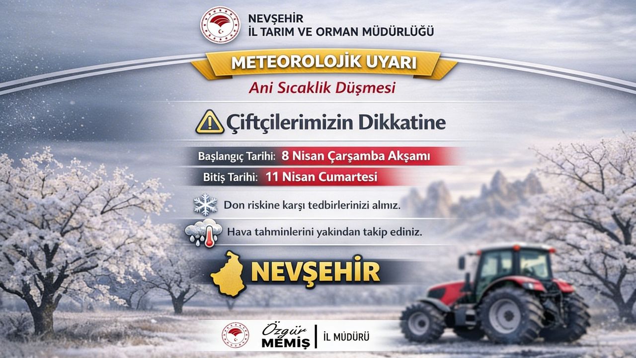 Nevşehir İl Tarım ve Orman Müdürü Özgür Memiş, Çarşamba akşamından itibaren illerde beklenen ani sıcaklık düşüşü ve don riski nedeniyle üreticilere uyarıda bulundu. Yetkililer, bu meteorolojik hadisenin 8 Nisan Çarşamba akşamından 11 Nisan Cumartesi sabahına kadar süreceğini belirtti.
