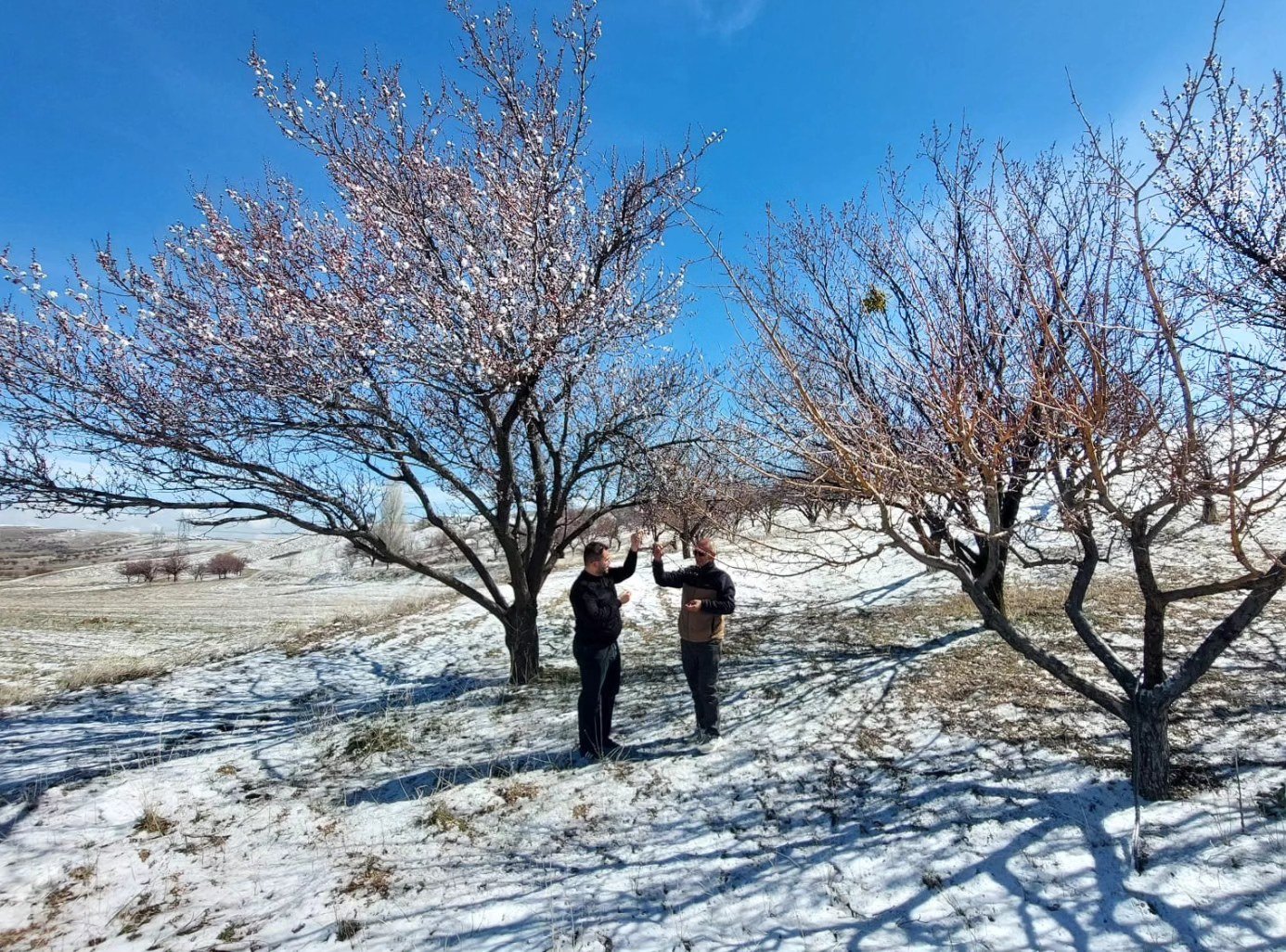 Nevşehir’de hava sıcaklıklarının sıfırın altına düşmesiyle birlikte çiçek açan meyve ağaçlarını (kayısı, elma, armut, ceviz, üzüm) korumak isteyen çiftçiler, bahçelerinde adeta nöbet tutuyor. Don riskine karşı ateş yakarak ve traktörlerle sisleme yöntemi uygulayan üreticiler, oluşabilecek olumsuz etkileri önlemeye çalışıyor.