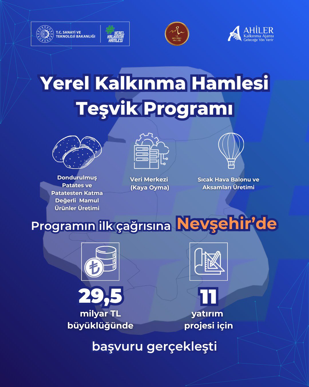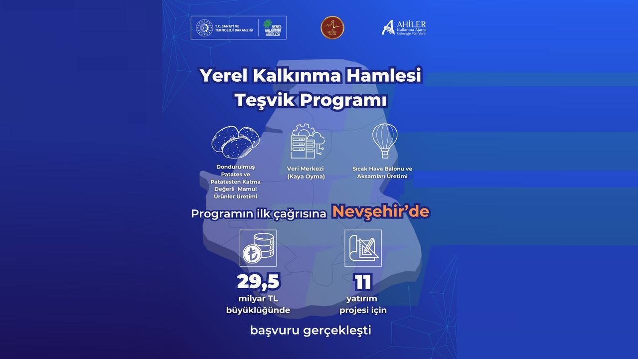 T.C. Sanayi ve Teknoloji Bakanlığı Kalkınma Ajansları Genel Müdürlüğü ile Ahiler Kalkınma Ajansı koordinasyonunda yürütülen Yerel Kalkınma Hamlesi Teşvik Programı kapsamında Nevşehir’den yapılan başvurular dikkat çekti. Program çerçevesinde Nevşehir ilinden toplam 11 ön başvuru alındığı açıklandı.