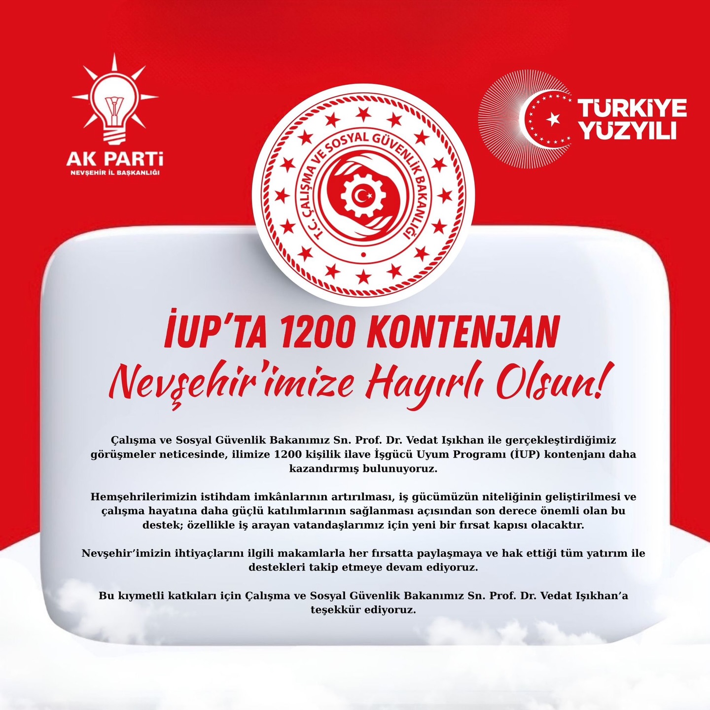 AK Parti Nevşehir İl Başkanı Av. Muhammed Feyzi Aygün, Milletvekilleri Süleyman Özgün ve Emre Çalışkan, Çalışma ve Sosyal Güvenlik Bakanı Prof. Dr. Vedat Işıkhan ile yapılan görüşmeler sonucunda Nevşehir’e 1200 kişilik ilave İşgücü Uyum Programı (İUP) kontenjanı kazandırıldığını duyurdu.