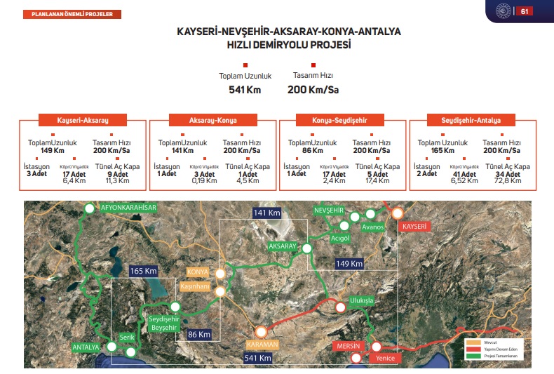 Ulaştırma ve Altyapı Bakanı Abdulkadir Uraloğlu, planlanan en önemli projelerden birinin Kayseri–Nevşehir–Aksaray–Konya–Antalya Hızlı Demiryolu Projesi olduğunu açıkladı.