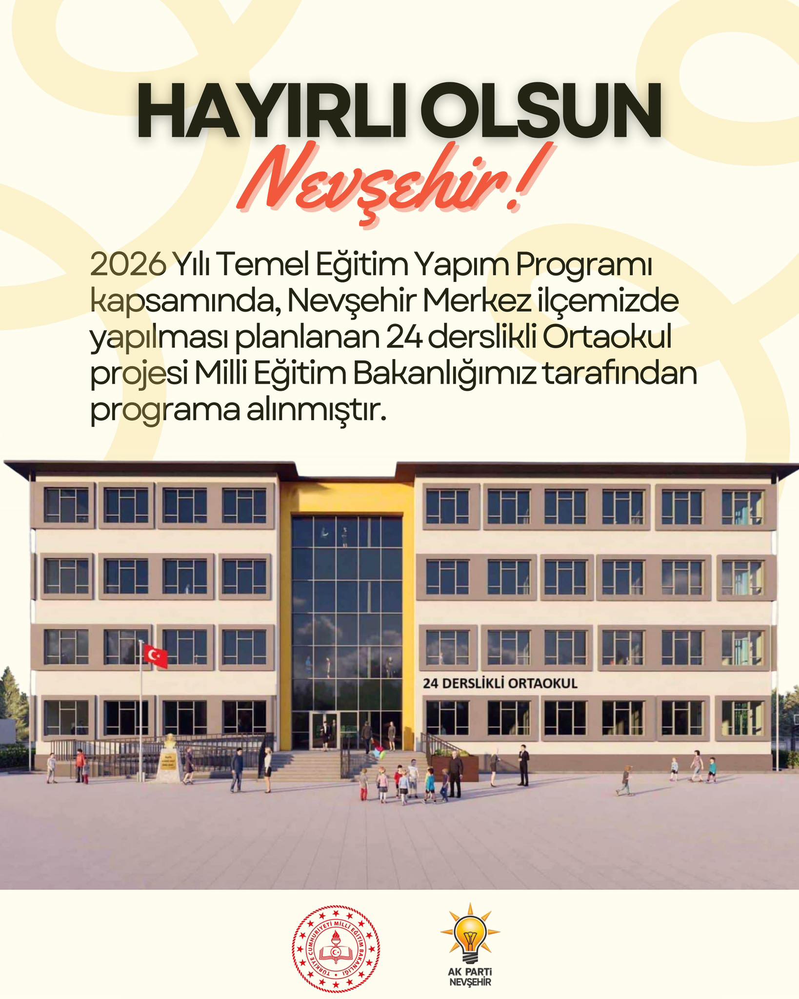 AK Parti Nevşehir İl Başkanı Av. Muhammed Feyzi Aygün ile Nevşehir Milletvekilleri Süleyman Özgün ve Emre Çalışkan, yaptıkları ortak açıklamayla Nevşehir Merkez ilçede yapılması planlanan 24 derslikli ortaokul projesinin, Milli Eğitim Bakanlığı tarafından 2026 Yılı Temel Eğitim Yapım Programı kapsamına alındığını duyurdu.
