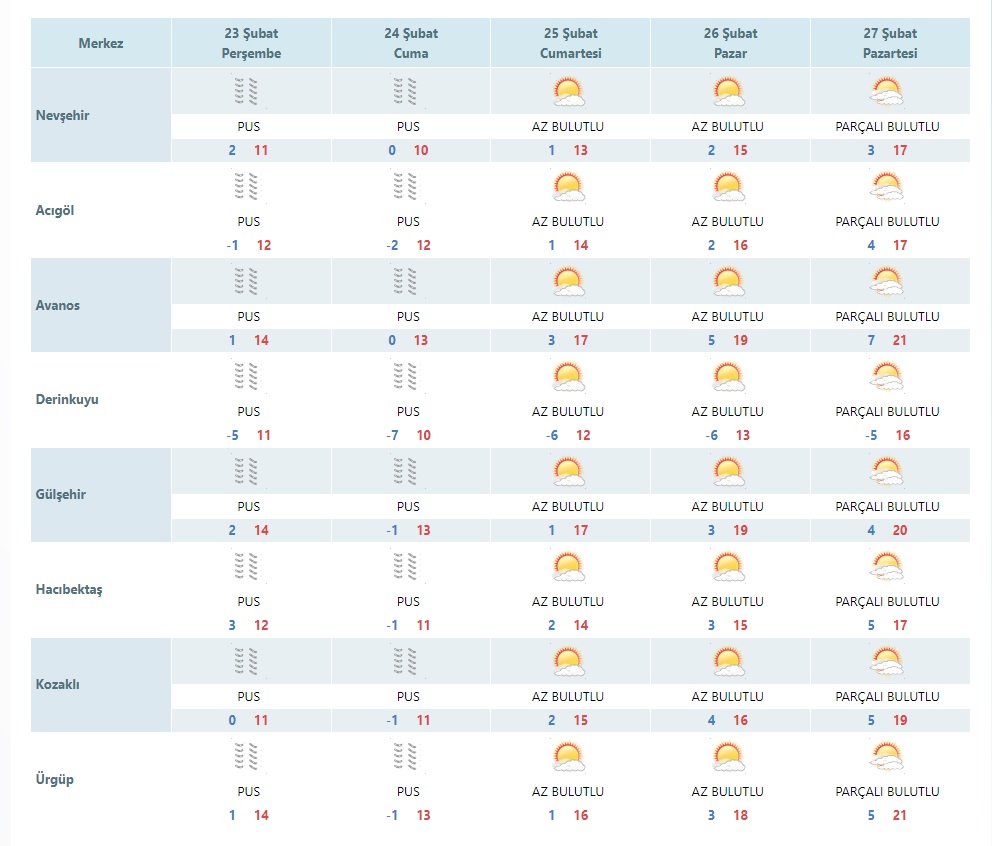 Nevşehir ve İlçelerinde 5 Günlük Hava Tahmini
