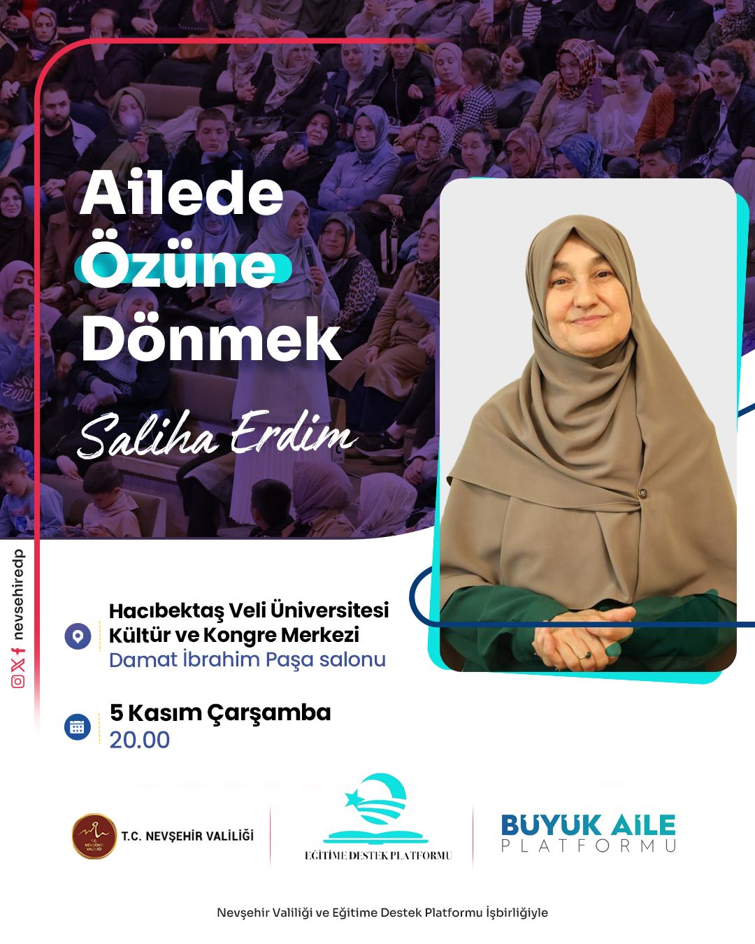 Nevşehir Valiliği, Eğitime Destek Platformu ve Büyük Aile Platformu iş birliğiyle düzenlenen bu özel program, 5 Kasım Çarşamba günü saat 20.00’de, Nevşehir Hacı Bektaş Veli Üniversitesi Kültür ve Kongre Merkezi, Damat İbrahim Paşa Salonu’nda gerçekleştirilecek.