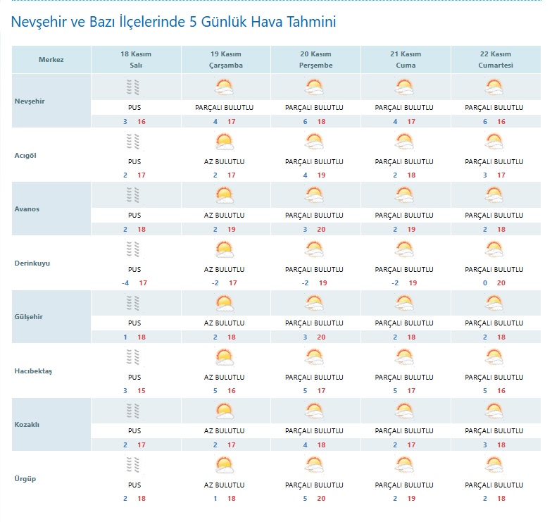 | Nevşehir | Pus | Parçalı Bulutlu | Parçalı Bulutlu | Parçalı Bulutlu | Parçalı Bulutlu |