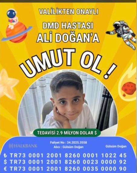 Nevşehir’in Acıgöl ilçesine bağlı Kurugöl Köyü nüfusuna kayıtlı olan ve ailesiyle birlikte İstanbul’da yaşayan 9 yaşındaki Ali Doğan, nadir görülen genetik bir kas hastalığı olan Duchenne Musküler Distrofi (DMD) ile mücadele ediyor. Küçük Ali’nin hayata tutunabilmesi için tek umut ise yurt dışında uygulanan gen tedavisine ulaşmak.