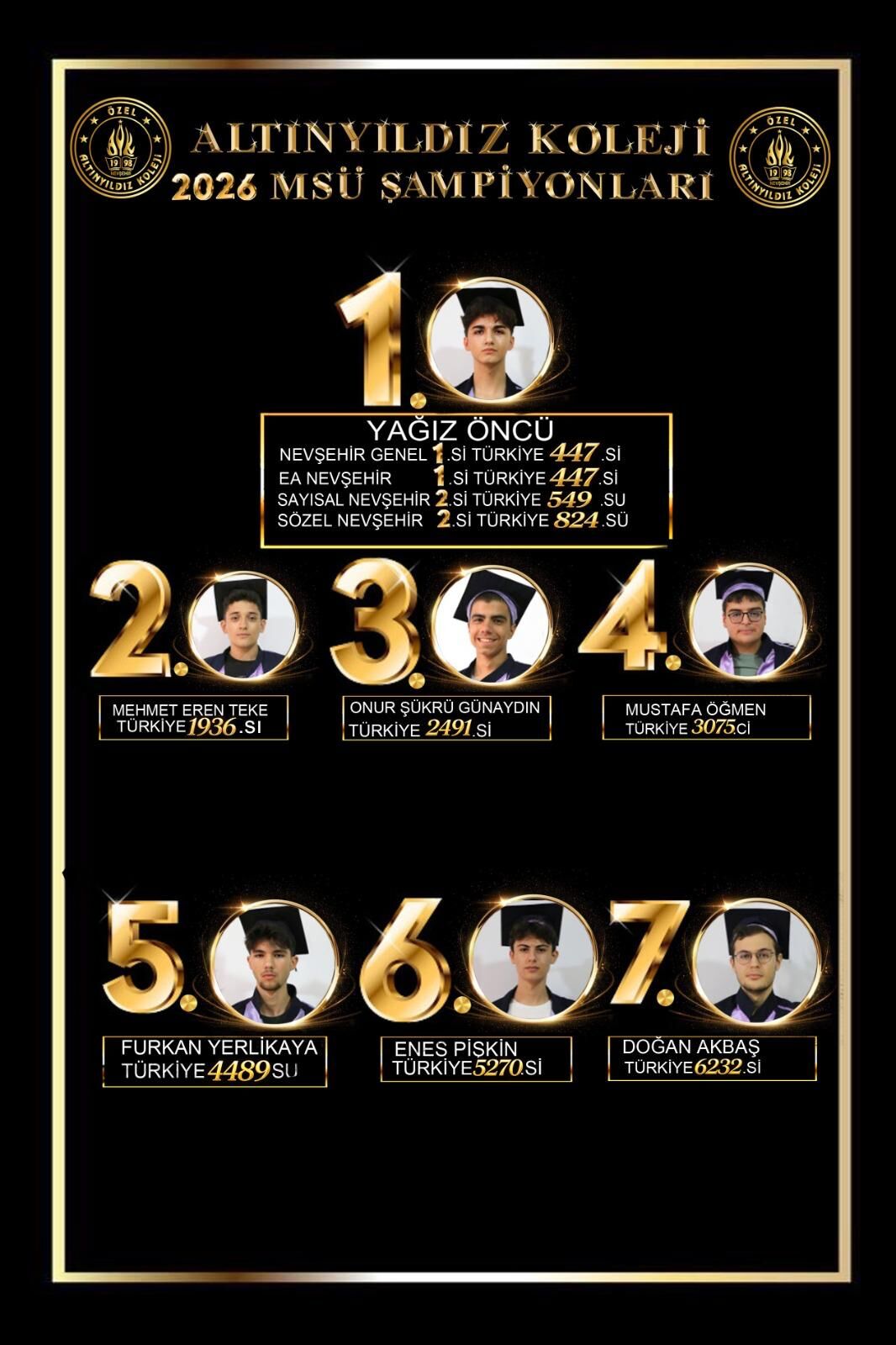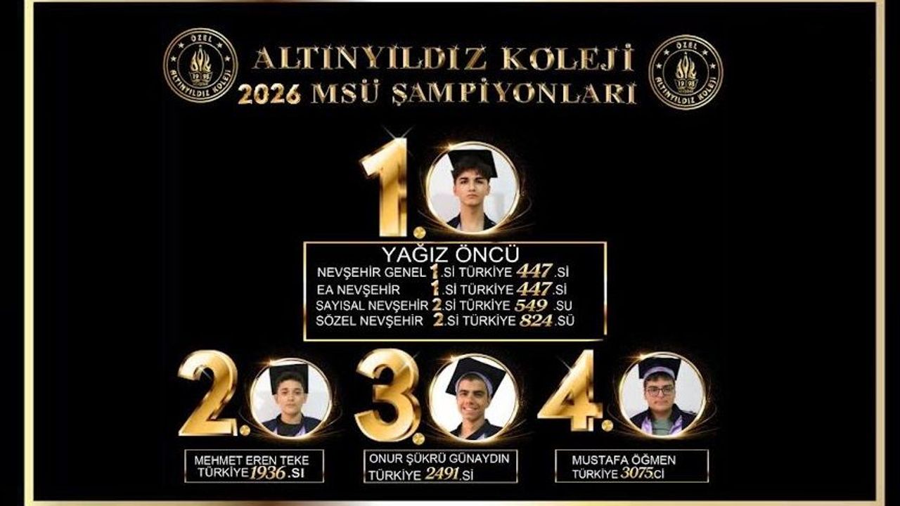 Nevşehir’in tek ve rakipsiz okulu, çeyrek asırdır zirvenin değişmeyen adresi Altınyıldız Koleji Fen ve Anadolu Lisesi öğrenci, veli ve öğretmenlerimizi tebrik eder; 2026 YKS’de tüm öğrencilerimize üstün başarılar dileriz.