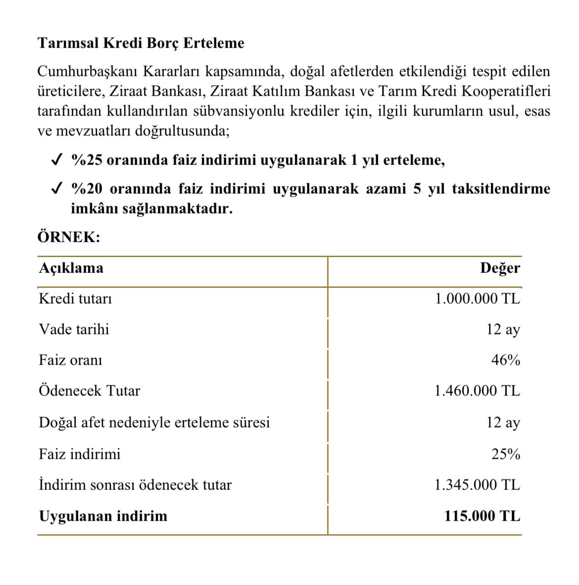 Alınan bu karar ile afetlerden zarar gören çiftçilerin finansal yükünün hafifletilmesi ve üretimlerini sürdürebilmeleri hedefleniyor.