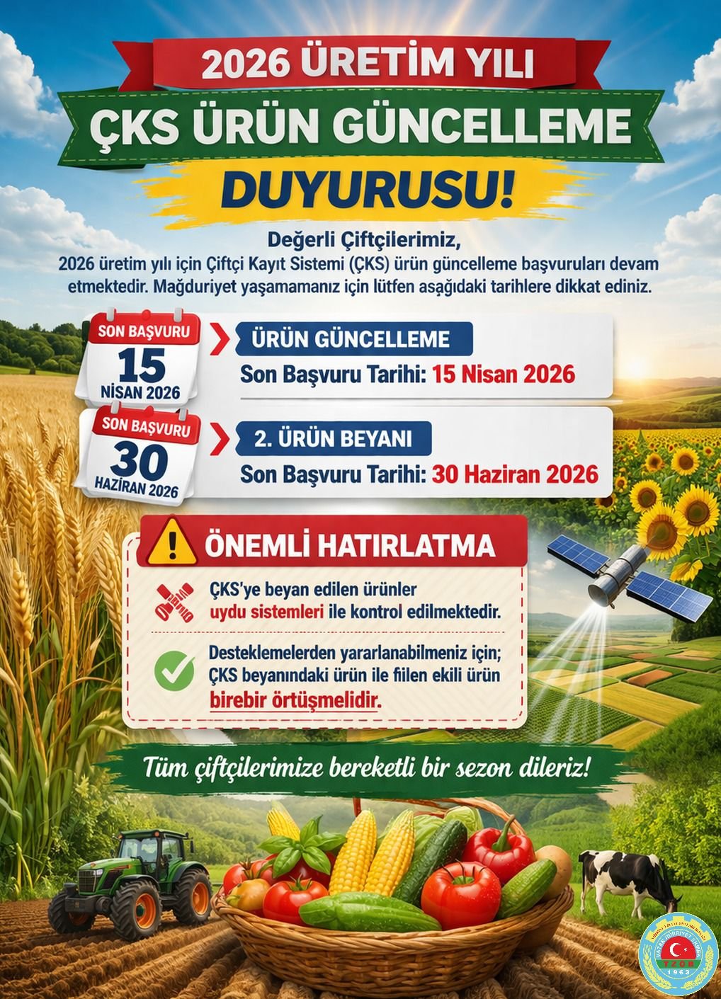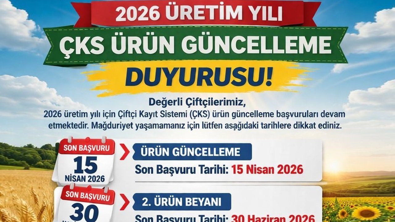 Çiftçi Kayıt Sistemi (ÇKS) kapsamında 2026 üretim yılı ürün güncelleme başvurularında son günün 15 Nisan olduğu hatırlatıldı. Çiftçilerin mağduriyet yaşamamaları için beyanlarını kontrol etmeleri ve güncellemelerini zamanında yapmaları istendi.