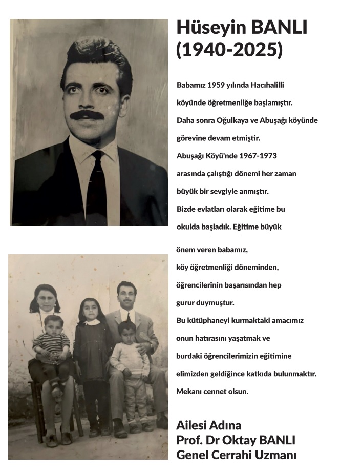 “Babam Hüseyin Banlı anısına Abuuşağı Köyü İlköğretim Okulu’nda kütüphane yaptırdık. 92 öğrencisi bulunan okulda 2.500 kitaplık, okuma salonlu büyük bir kütüphane oldu. Umarım ilkokula bu okulda başlayıp profesörlüğe giden yolumuz bazı öğrencilere örnek olur.”