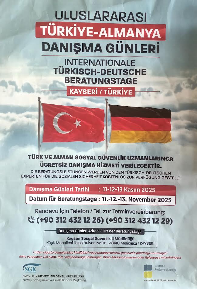 Sosyal Güvenlik Kurumu (SGK) ile Alman Emeklilik Sigortası Kurumları iş birliğinde düzenlenecek olan “Türkiye – Almanya Danışma Günleri”, 11-12-13 Kasım 2025 tarihlerinde Kayseri Sosyal Güvenlik İl Müdürlüğü Hizmet Binası’nda yapılacak.