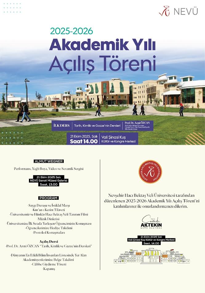 Akademik yılın İlk Dersini, Fatih Sultan Mehmet Vakıf Üniversitesi öğretim üyesi ve Türk Maarif Ansiklopedisi Bilim Kurulu Başkanı Prof. Dr. Azmi Özcan verecek. Prof. Dr. Özcan, NEVÜ öğrencilerine “Tarih, Kimlik ve Gazze’nin Dersleri” başlıklı konuşmasıyla hitap edecek.
