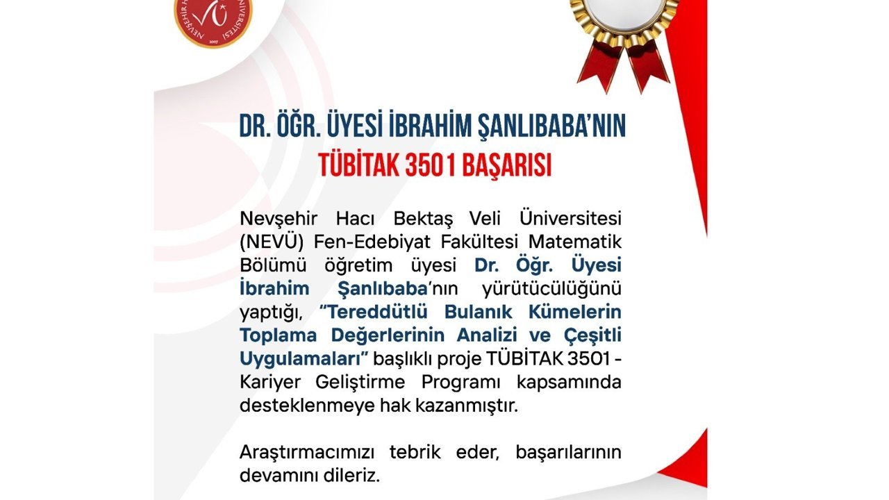 Nevşehir Hacı Bektaş Veli Üniversitesi (NEVÜ) Fen-Edebiyat Fakültesi Matematik Bölümü öğretim üyesi Dr. Öğr. Üyesi İbrahim Şanlıbaba’nın yürütücülüğünü yaptığı, “Tereddütlü Bulanık Kümelerin Toplama Değerlerinin Analizi ve Çeşitli Uygulamaları” başlıklı proje TÜBİTAK 3501 - Kariyer Geliştirme Programı kapsamında desteklenmeye hak kazandı.