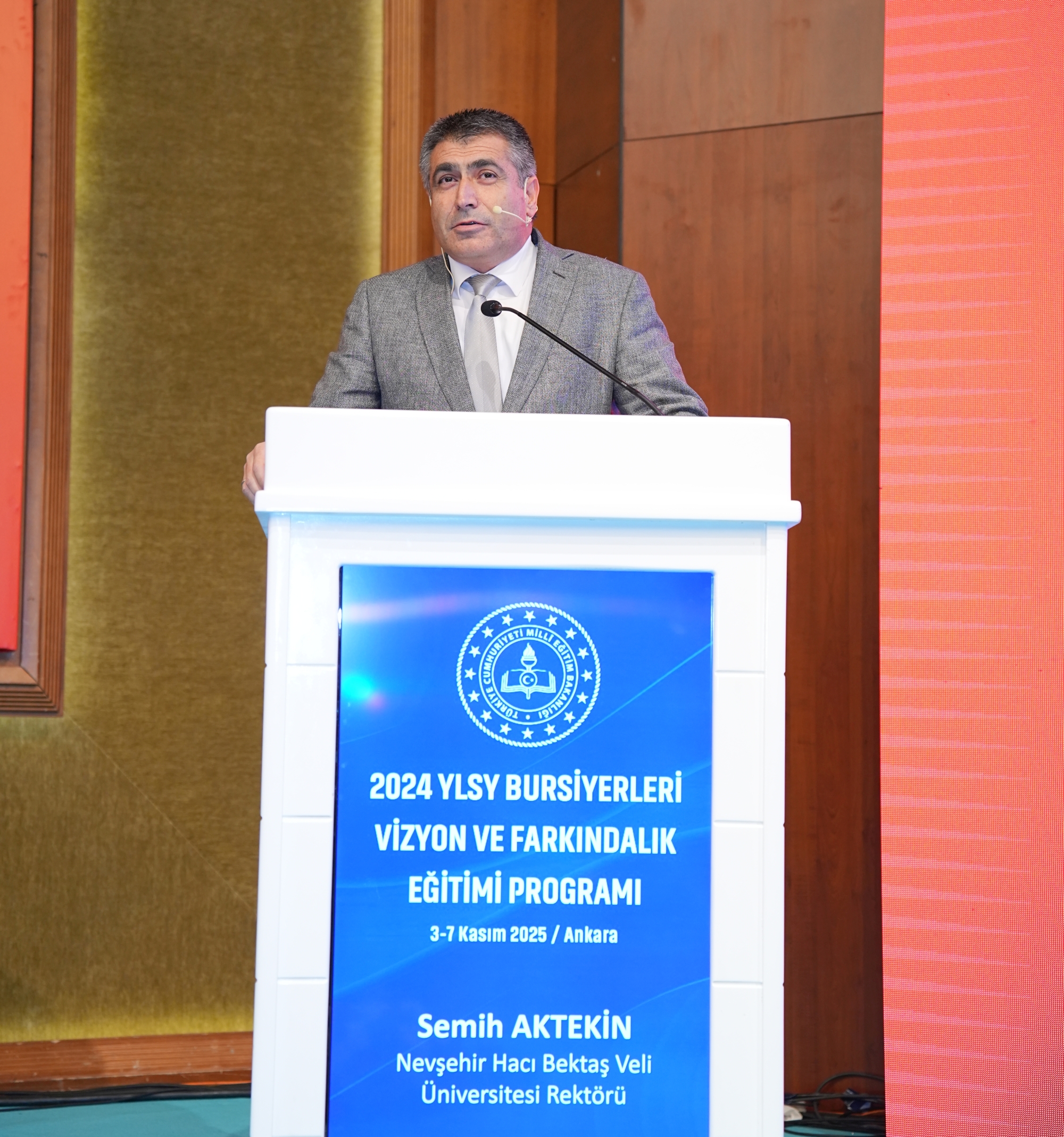 Nevşehir Hacı Bektaş Veli Üniversitesi (NEVÜ) Rektörü Prof. Dr. Semih Aktekin, T.C. Millî Eğitim Bakanlığı (MEB) Yükseköğretim ve Yurt Dışı Eğitim Genel Müdürlüğü tarafından Millî Eğitim Bakanı Prof. Dr. Yusuf Tekin’in teşrifleriyle Ankara Kızılcahamam’da düzenlenen ve 2024 YLSY (Yurt Dışına Lisansüstü Öğrenim Görmek Üzere Gönderilecek Öğrencileri Seçme ve Yerleştirme) Bursiyerleri Vizyon ve Farkındalık Eğitimi Programı kapsamında bursiyer öğrencilerle buluştu.