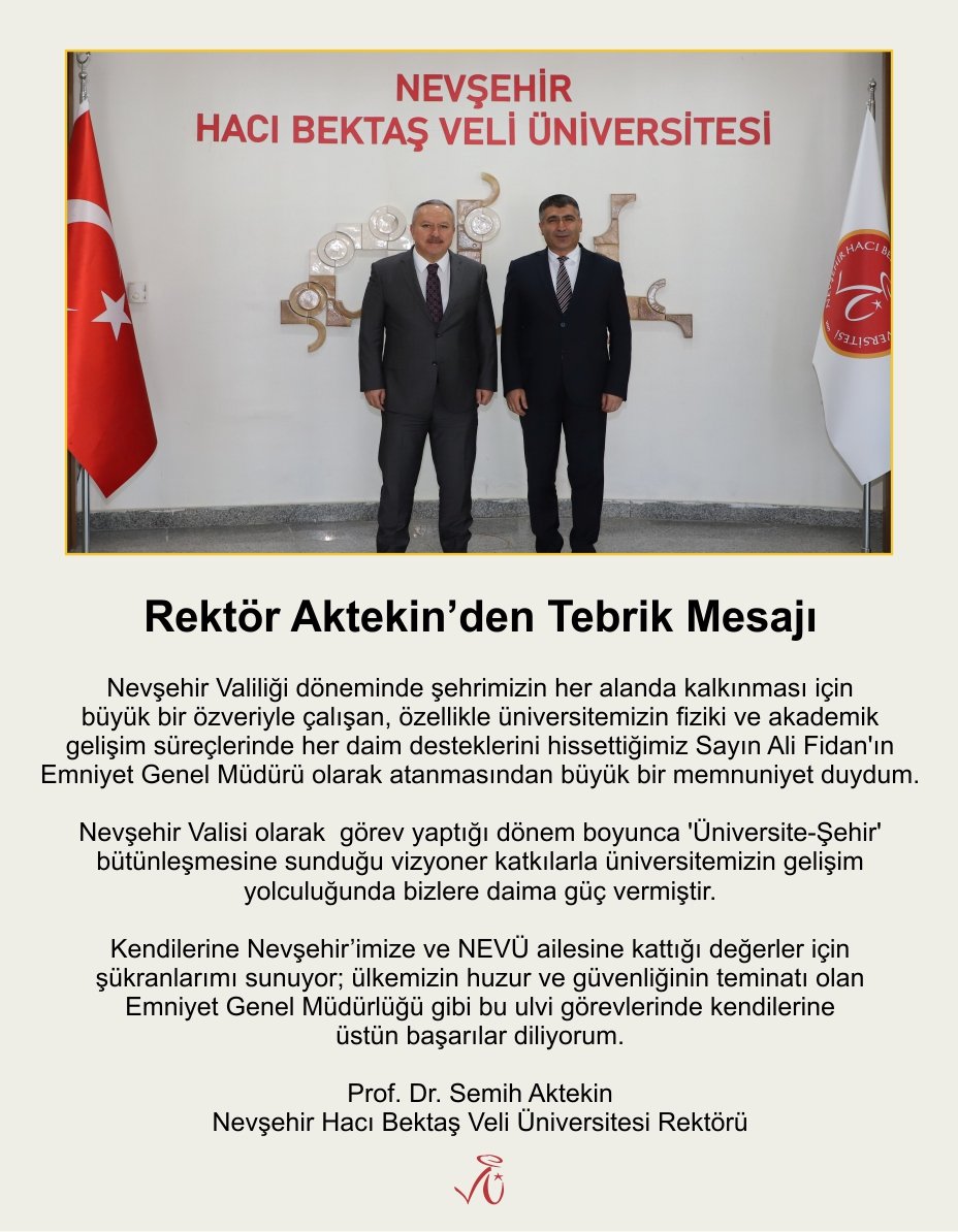 Nevşehir Hacı Bektaş Veli Üniversitesi (NEVÜ) Rektörü Prof. Dr. Semih Aktekin, Cumhurbaşkanı Recep Tayyip Erdoğan’ın takdirleriyle Emniyet Genel Müdürlüğü görevine atanan Nevşehir Valisi Ali Fidan için tebrik mesajı yayımladı.