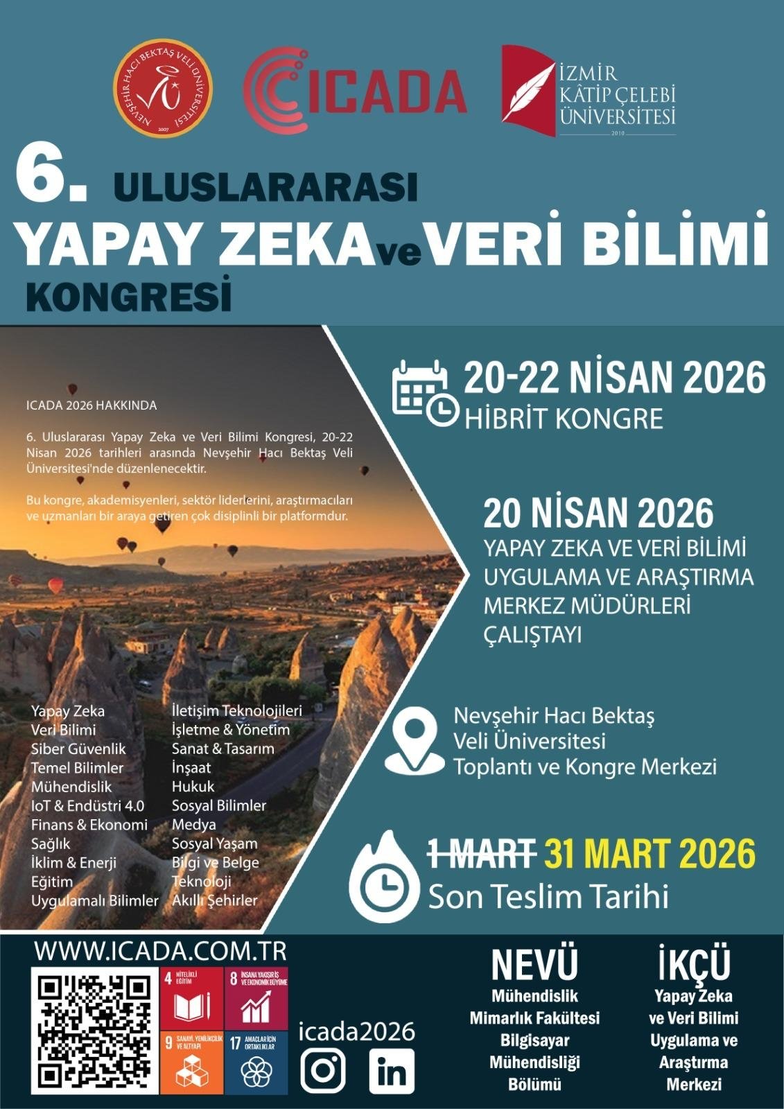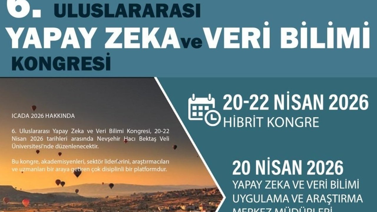 Nevşehir Hacı Bektaş Veli Üniversitesi (NEVÜ)’de bilim, teknoloji ve hukuk alanlarını aynı çatı altında buluşturan “6. Uluslararası Yapay Zeka ve Veri Bilimi Kongresi (ICADA 2026)” düzenlenecek.