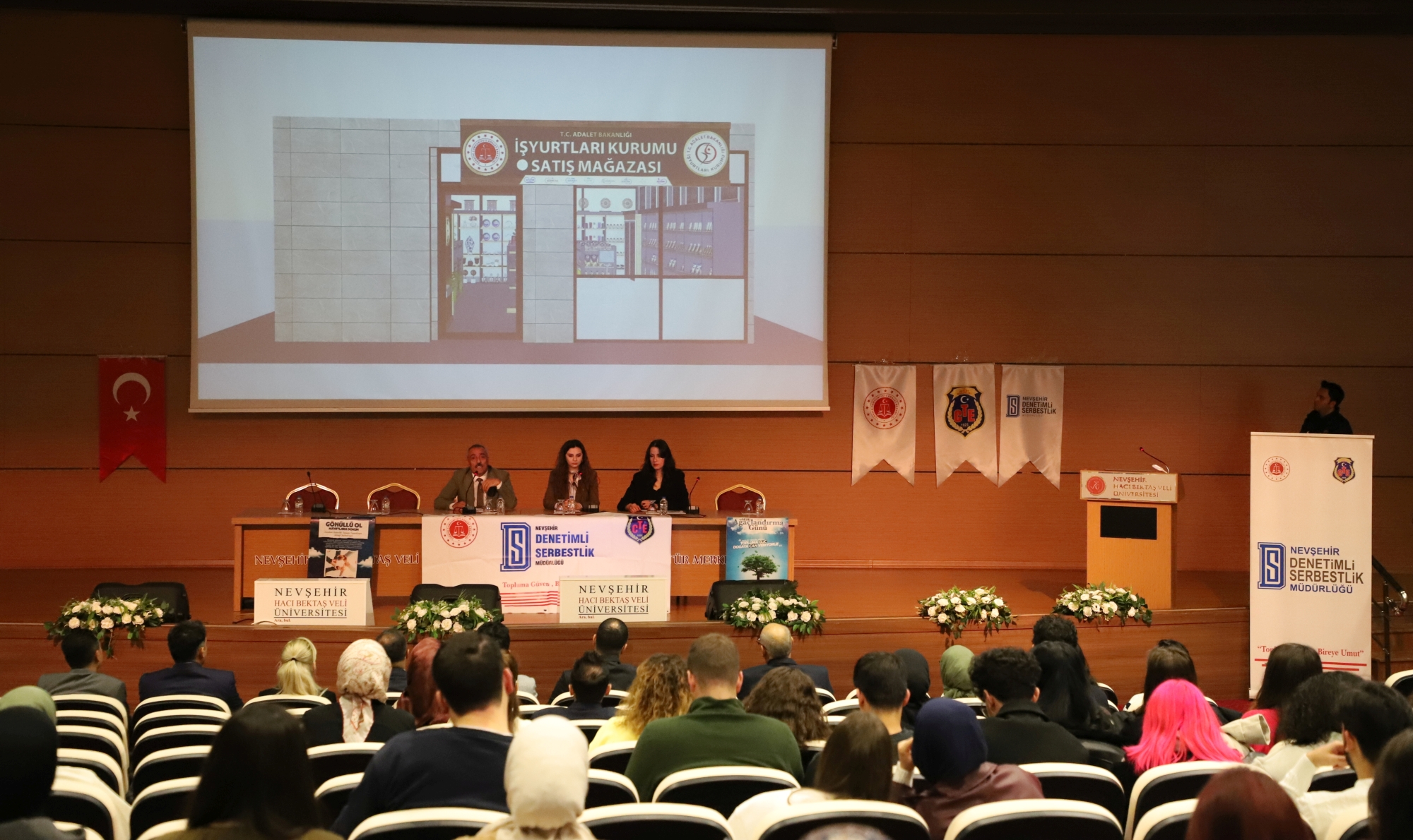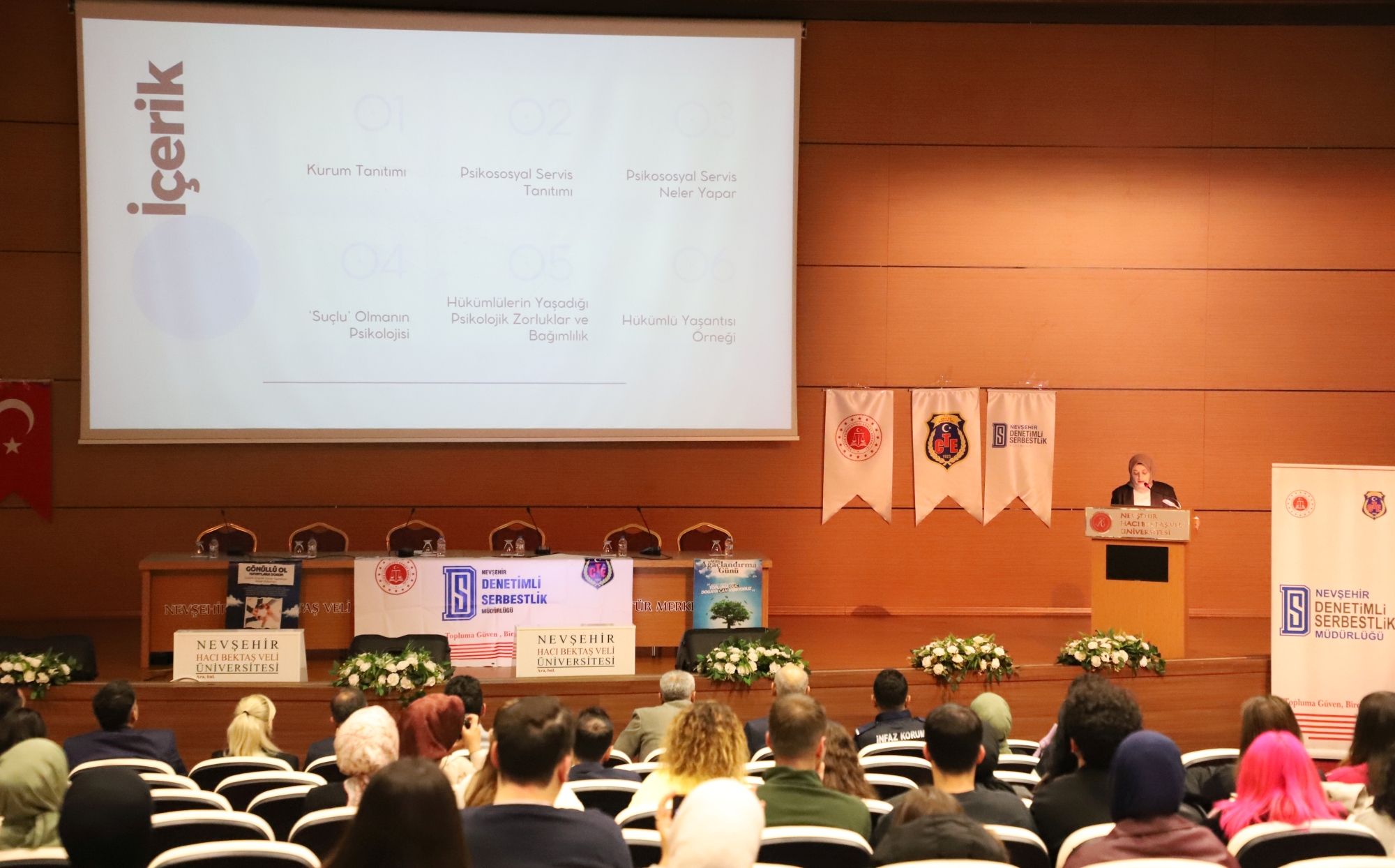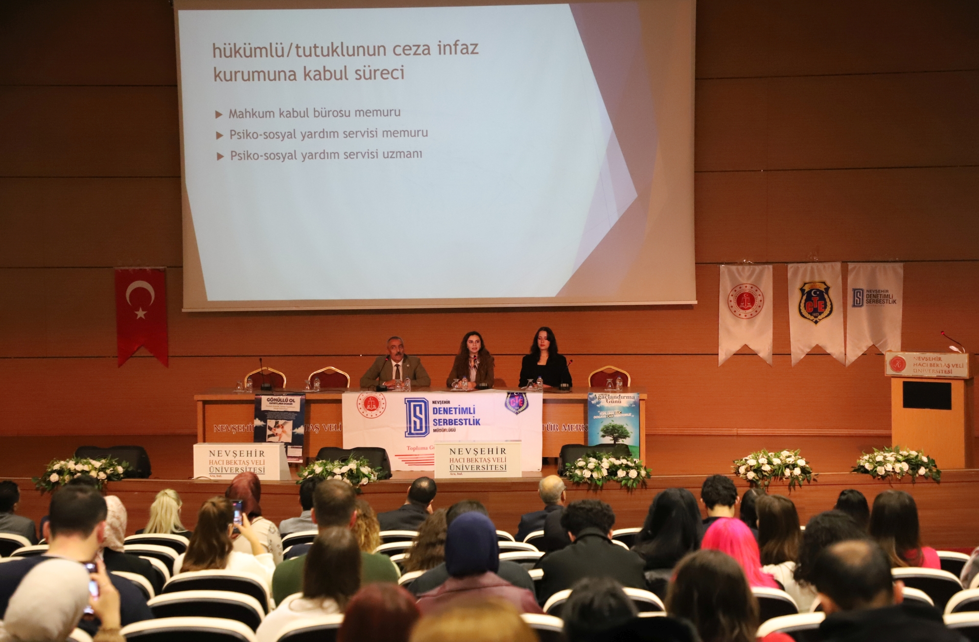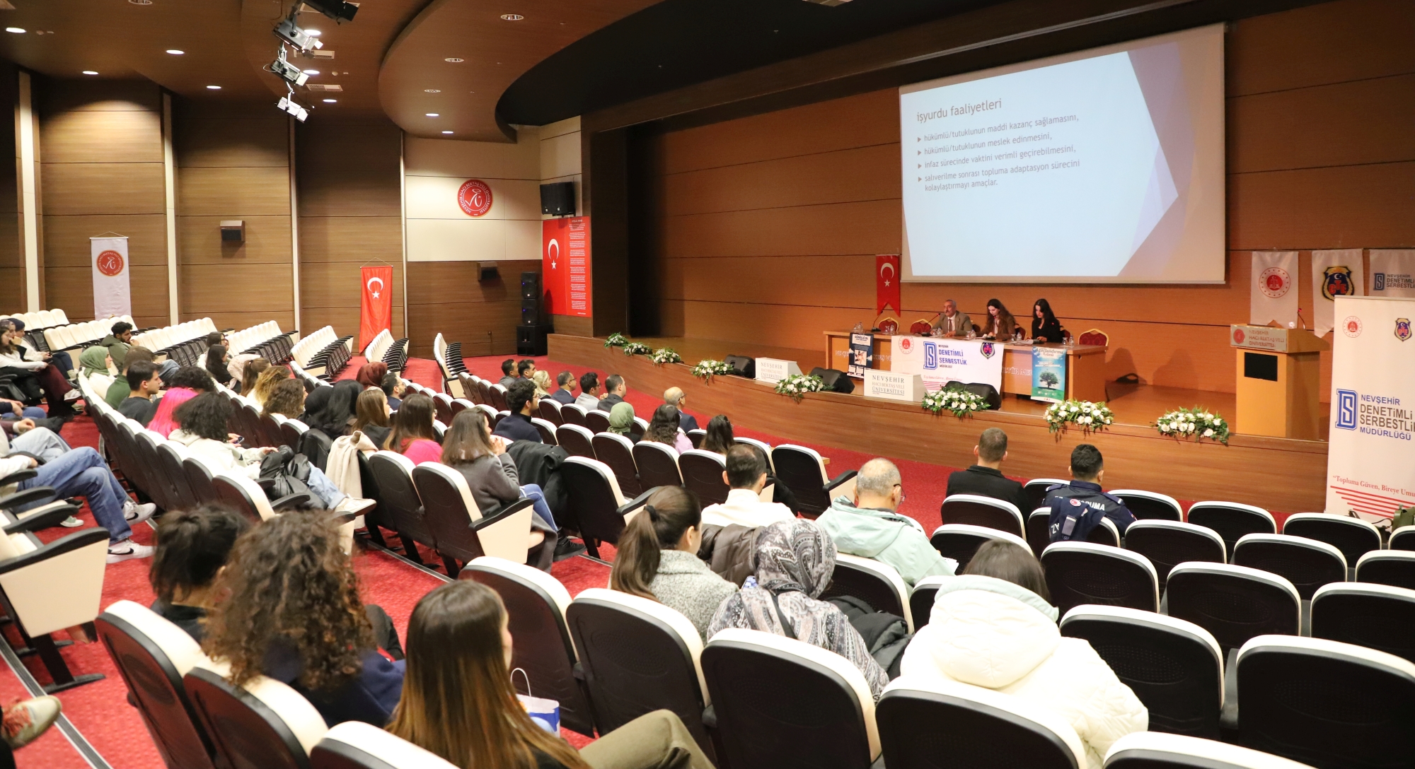 Konferansta Nevşehir E Tipi Kapalı Ceza İnfaz Kurumu Müdürü Ahmet Yıldız, kapalı ceza evlerinin yapısı ve işleyişini ana hatlarıyla açıkladıktan sonra ceza evleri bünyesinde üretim yapan İşyurtları Kurumlarının fonksiyonları ve faaliyetleri hakkında bilgi verdi. Kurum psikologları Büşra Gökçen Türksoy ve Büşra Akpınar, ceza infaz kurumlarında hükümlülerin kabul süreçleri, psikososyal değerlendirme, iyi hâl kavramı ve bireysel iyileştirme programlarının oluşturulması hakkında detaylı bilgilendirmede bulundu. Sunumlarda hükümlülerin suç işlemelerine neden olan etkenlerin analiz edildiği, buna göre kişiye özel programların geliştirildiği ve kurumlarda spor salonu, iş atölyeleri, kütüphane ve eğitim alanları gibi imkânlardan yararlanmanın psikososyal servis tarafından planlandığı aktarıldı. Ayrıca madde bağımlılığıyla mücadele kapsamında YEDAM iş birliği, SAMBA programı ve bağımlılık sonrası sosyal uyum çalışmalarının önemi vurgulandı.