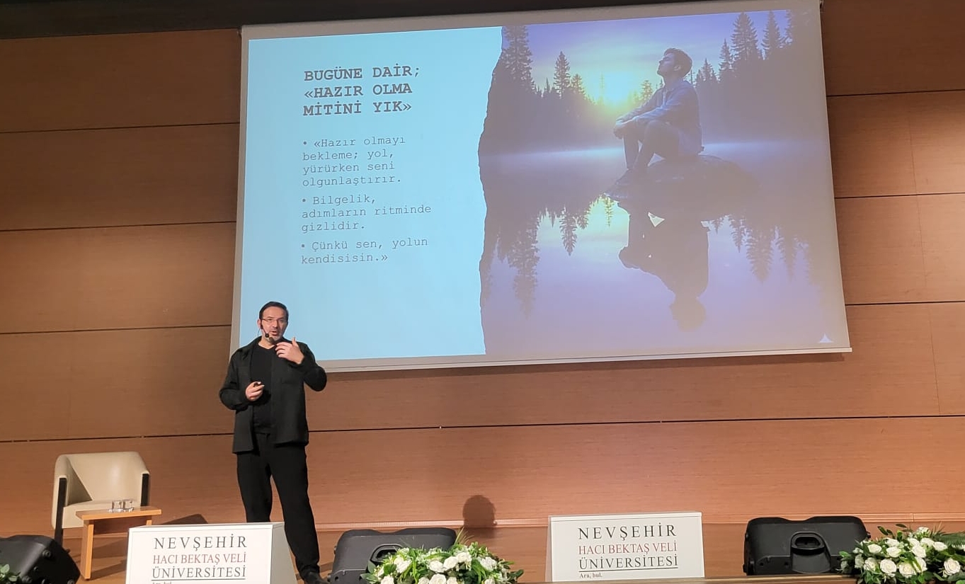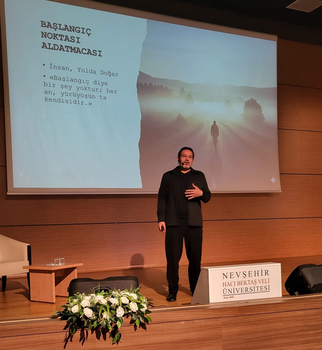 NEVÜ Vali Şinasi Kuş Kültür ve Kongre Merkezi Karavezir Salonu’nda gerçekleştirilen söyleşiye çok sayıda öğrenci katıldı. Doç. Dr. Davut Sarıtaş konuşmasında, “başlamak” kavramını bireyin yaşam serüveni içinde felsefi, psikolojik ve pedagojik bir çerçevede ele aldı. Başlangıcın çoğu zaman bir yanılsama olduğunu vurgulayan Sarıtaş, insanın zaten “yolda” olduğunu, önemli olanın ise küçük ama sürekli adımlar atabilme cesareti olduğunu ifade etti.