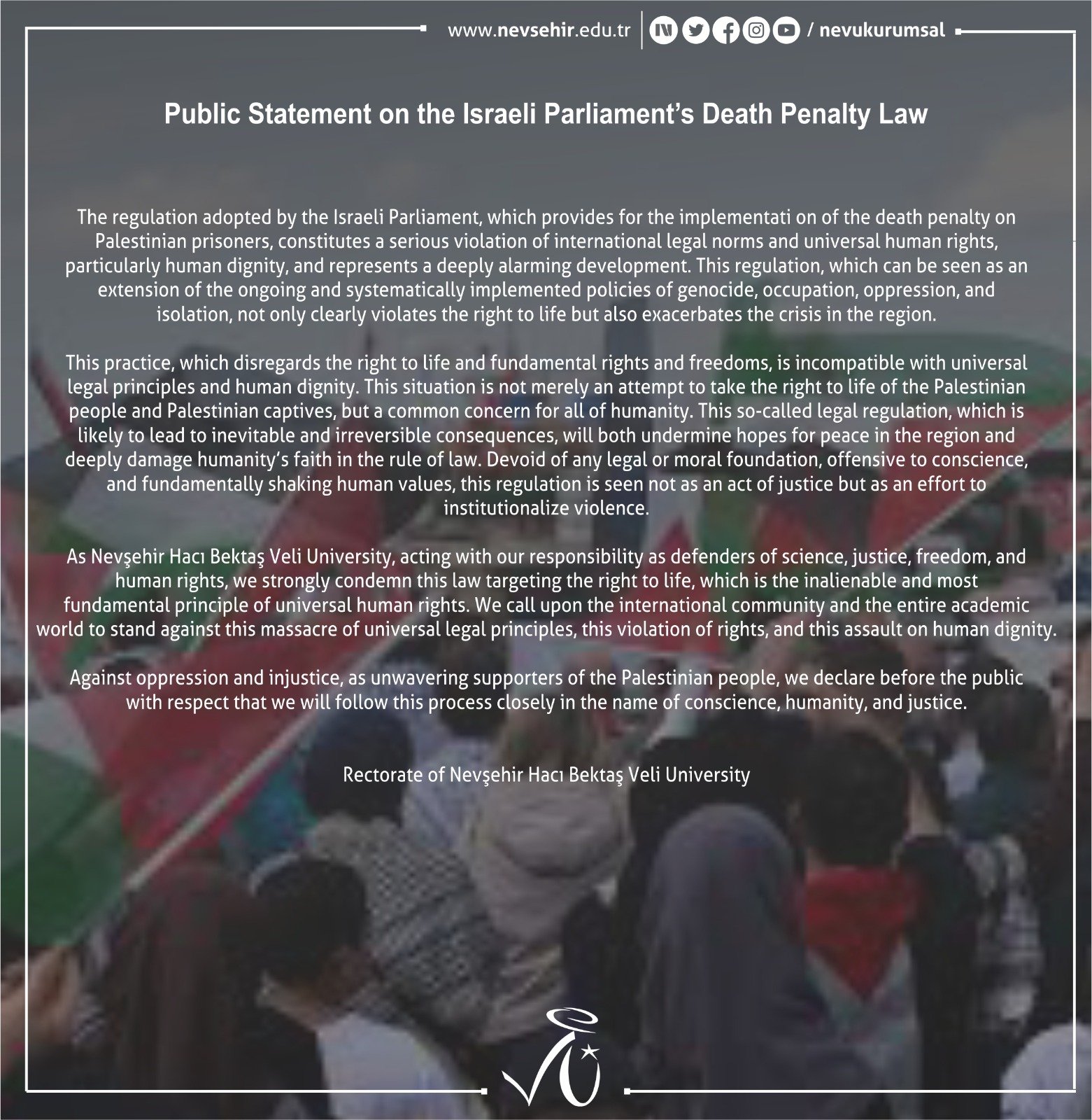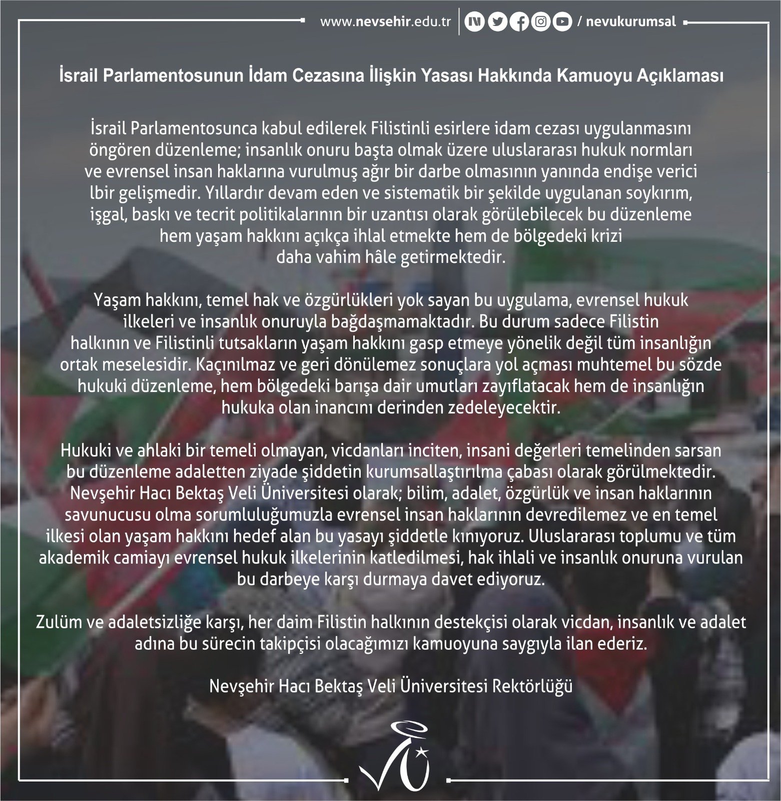 Nevşehir Hacı Bektaş Veli Üniversitesi (NEVÜ), İsrail Parlamentosu tarafından kabul edilerek Filistinli esirlere idam cezası uygulanmasını öngören düzenlemeye ilişkin Türkçe ve İngilizce kamuoyu açıklaması yaptı.