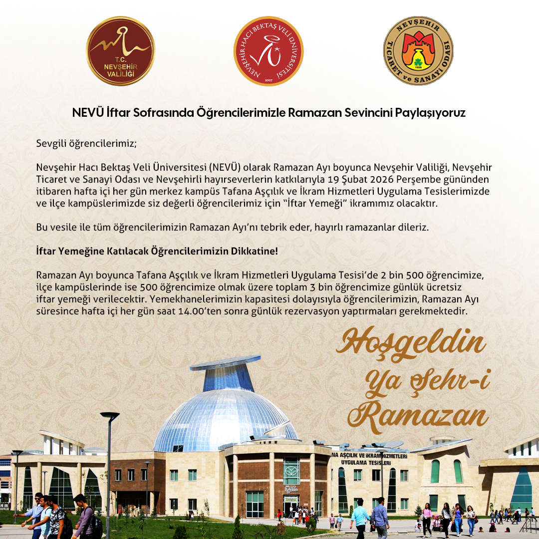 Nevşehir Hacı Bektaş Veli Üniversitesi (NEVÜ), geçtiğimiz yıllarda olduğu gibi bu yıl da geleneksel hale gelen Ramazan iftar programlarıyla öğrencilerini aynı sofrada buluşturmaya hazırlanıyor. NEVÜ tarafından 19 Şubat 2026 Perşembe gününden itibaren Ramazan ayı boyunca hafta içi her gün merkez ve ilçe kampüslerinde toplam 3 bin öğrenciye ücretsiz iftar yemeği hizmeti sunulacak.