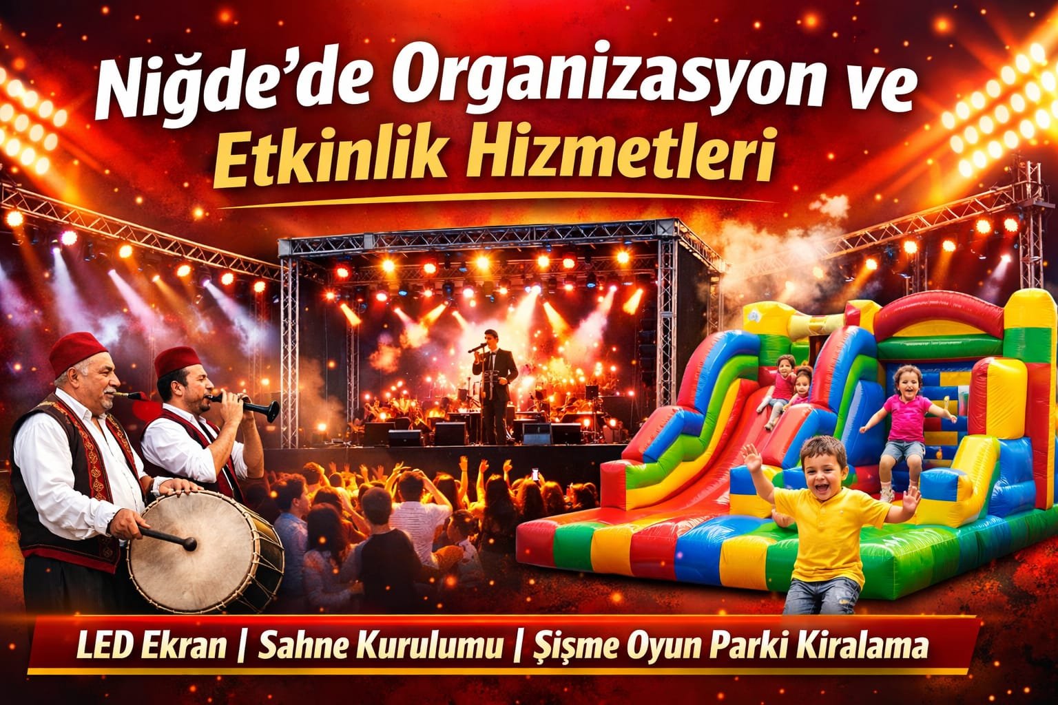 Niğde ve çevresinde LED ekran kiralama, sahne kurulumu, açılış organizasyonu ve şişme oyun parkı hizmetlerinde profesyonel çözümler!