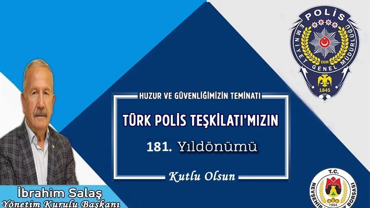 Nevşehir Ticaret Borsası (NTB) Yönetim Kurulu Başkanı İbrahim Salaş, Türk Polis Teşkilatı’nın 181. kuruluş yıl dönümü ve Polis Haftası dolayısıyla bir kutlama mesajı yayımladı.