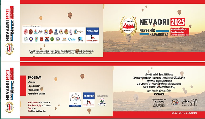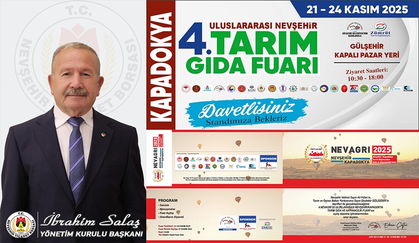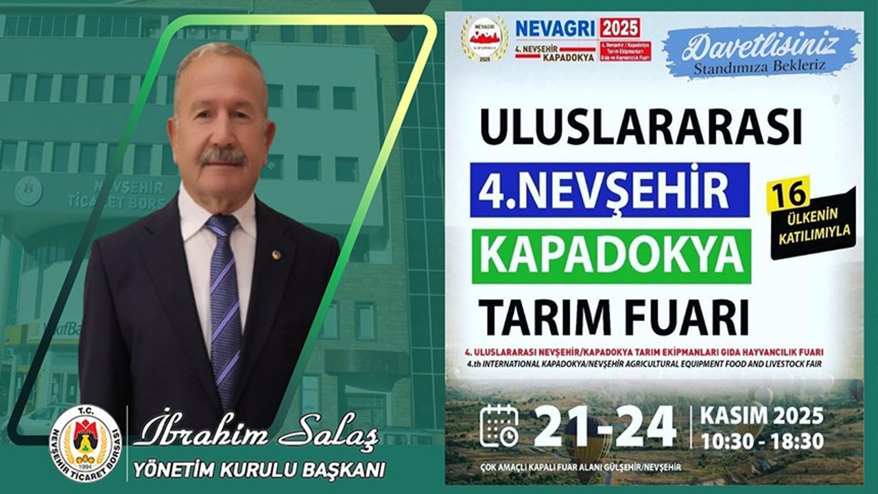 Nevşehir Ticaret Borsası Başkanı İbrahim Salaş, 21-24 Kasım 2025 tarihleri arasında gerçekleştirilecek 4.Nevagri’25 Uluslararası Nevşehir Tarım Gıda ve Hayvancılık Fuarı’na tüm vatandaşları davet etti.