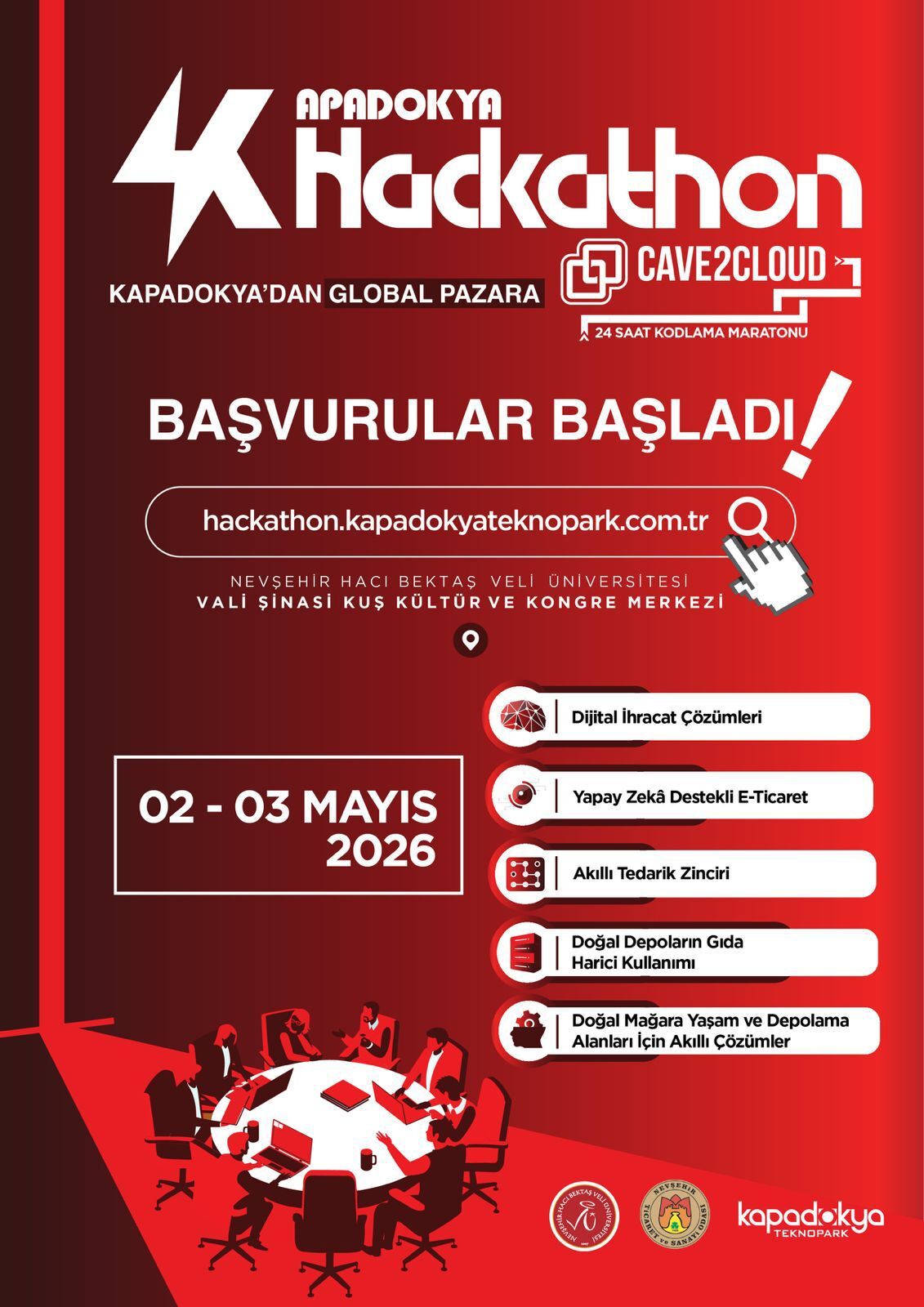 Nevşehir Ticaret ve Sanayi Odası, Nevşehir Hacı Bektaş Veli Üniversitesi ve Kapadokya Teknopark iş birliğinde 2-3 Mayısta düzenlenecek olan Kapadokya Hackathon, bölge sanayisinin dijital dönüşümüne katkı sağlamak ve yerel üretim gücünü küresel düzeyde rekabetçi seviyeye ulaştırmak amacıyla gerçekleştirilecektir. “Kapadokya’dan Global Pazara” sloganıyla düzenlenecek etkinlik, Nevşehir Hacı Bektaş Veli Üniversitesi ev sahipliğinde gerçekleştirilecektir. Nevşehir Ticaret ve Sanayi Odası etkinliğin düzenlenmesinde aktif ortak olarak yer almaktadır."