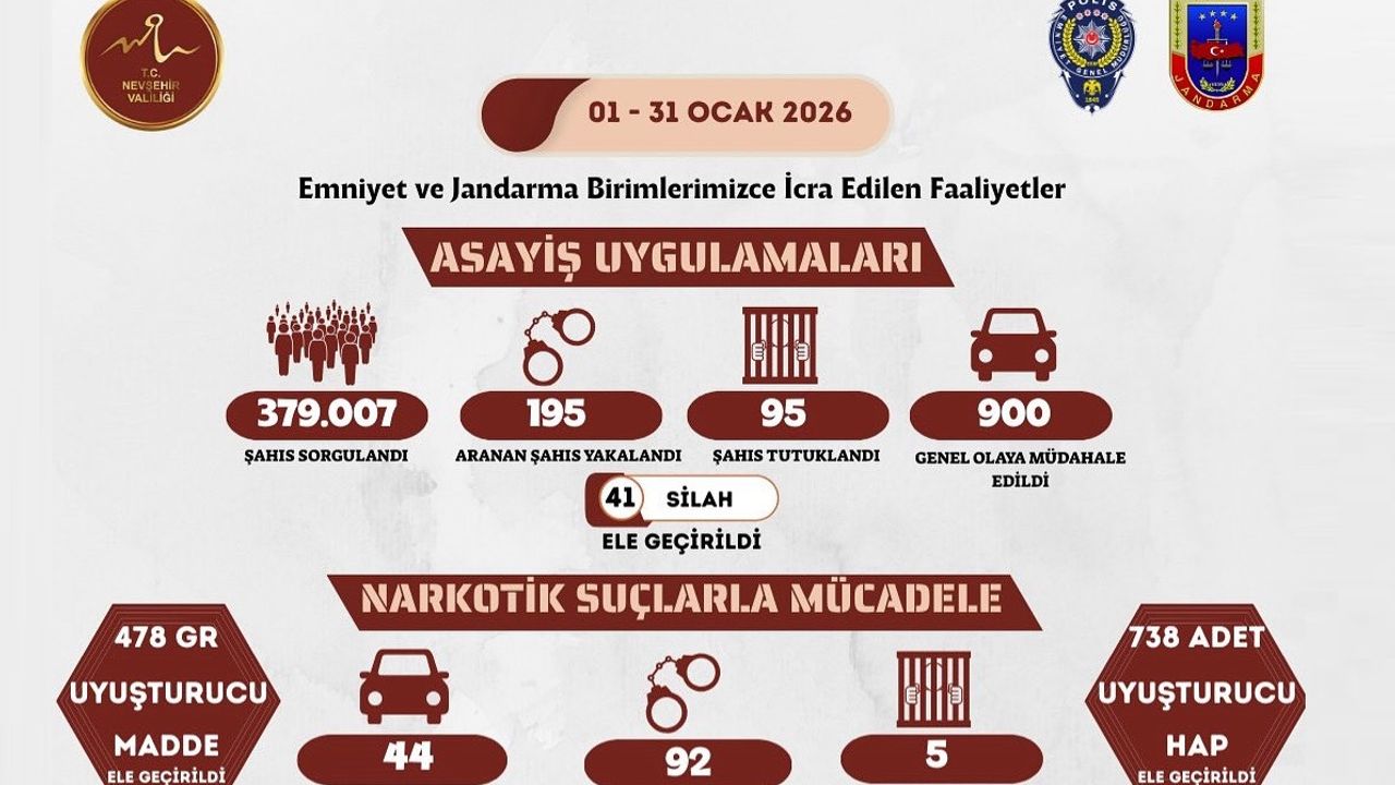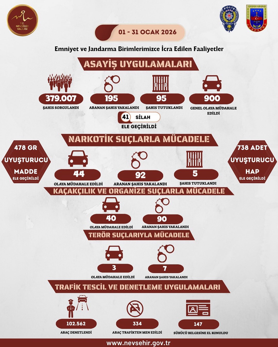 Nevşehir Valiliği koordinesinde Emniyet ve Jandarma birimleri, 01–31 Ocak 2026 tarihleri arasında kent genelinde huzur ve güven ortamının korunması amacıyla kapsamlı asayiş, narkotik, kaçakçılık, terör ve trafik uygulamaları gerçekleştirdi.