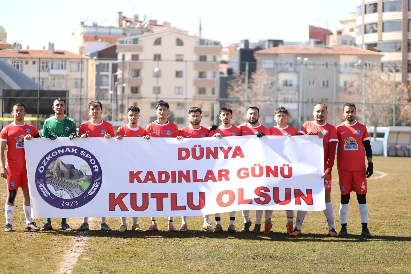 Nevşehir 1. Amatör Futbol Ligi’nde mücadele eden Özkonakspor, 8 Mart Dünya Kadınlar Günü dolayısıyla anlamlı bir farkındalık etkinliğine imza attı. Özkonaksporlu futbolcular, Nevşehir İl Özel İdarespor ile oynanan karşılaşma öncesinde sahaya “8 Mart Dünya Kadınlar Günü Kutlu Olsun” yazılı pankartla çıkarak kadınların gününü kutladı.