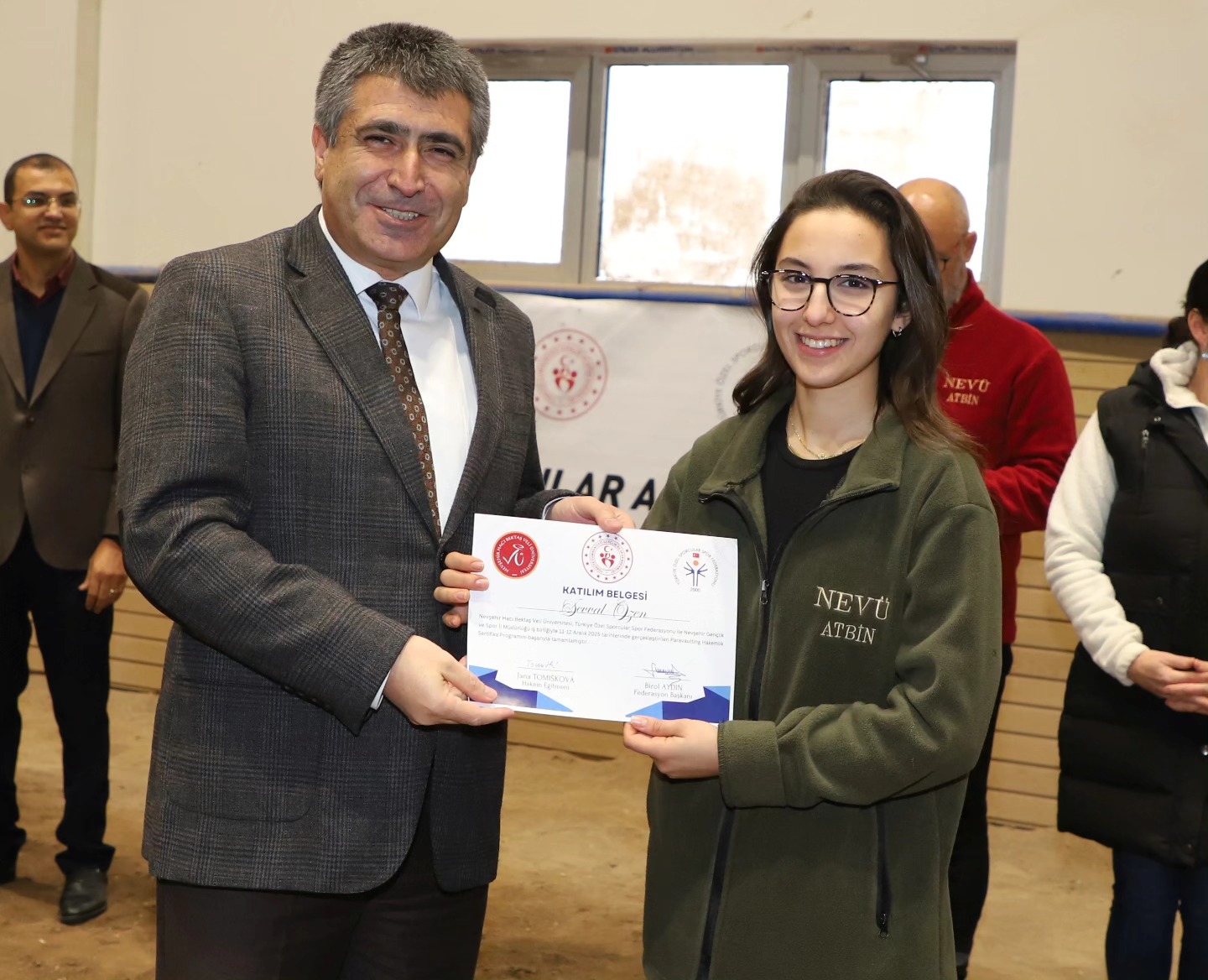 Nevşehir Hacı Bektaş Veli Üniversitesi (NEVÜ), Türkiye Özel Sporcular Spor Federasyonu ve Nevşehir Gençlik ve Spor İl Müdürlüğü iş birliğiyle düzenlenen “Paravaulting Hakemlik Sertifika Programı” 11-12 Aralık 2025 tarihlerinde tamamlandı. Programı başarıyla bitiren kursiyerlere sertifika ve madalyaları, NEVÜ Rektörü Prof. Dr. Semih Aktekin tarafından takdim edildi.