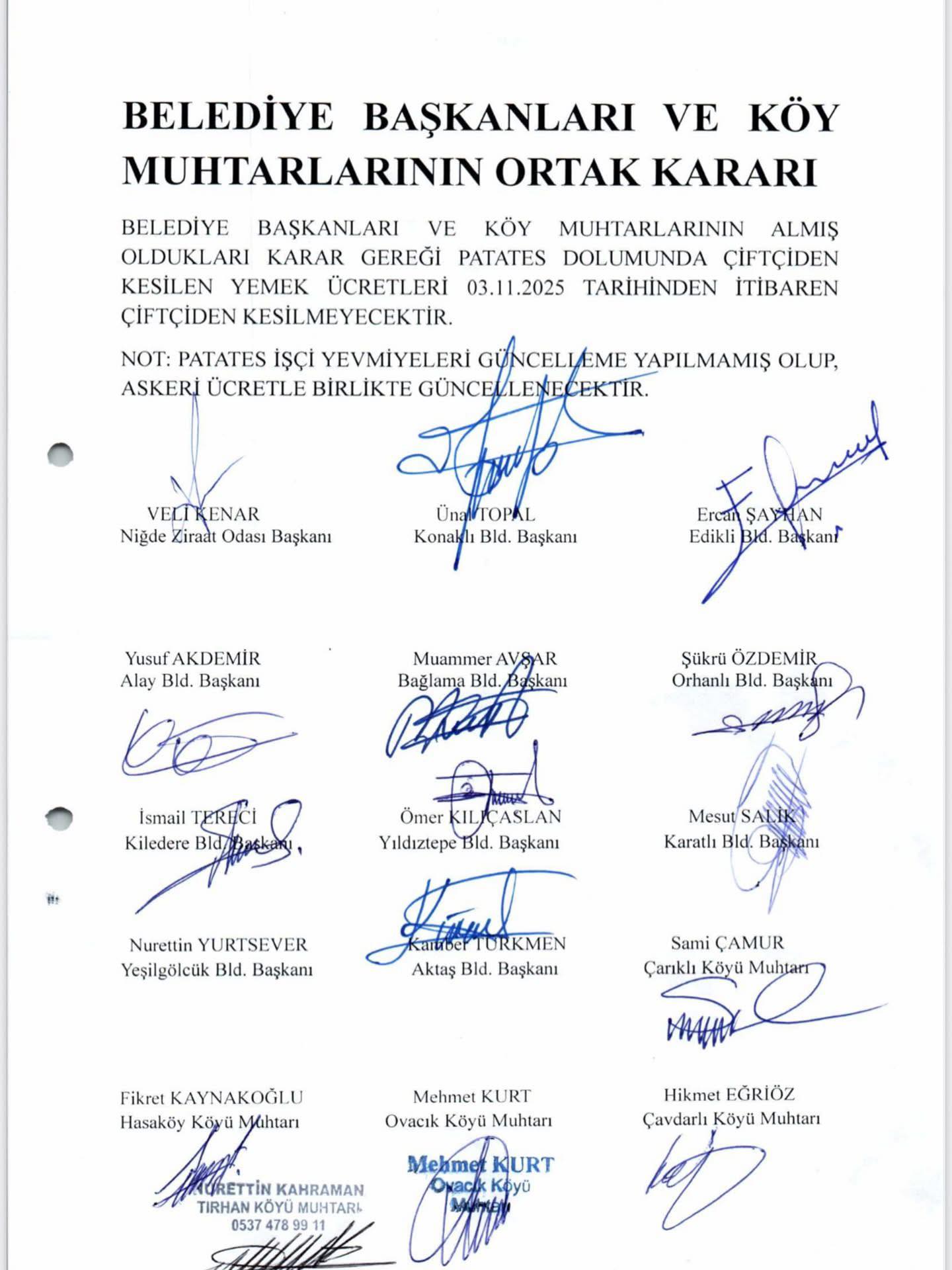 Niğde’nin Kiledere kasabasında gerçekleştirilen toplantıda, belediye başkanları ve köy muhtarları önemli bir karar aldı. Yapılan görüşmeler sonucunda, 03 Kasım 2025 tarihinden itibaren patates dolumunda çiftçilerden yemek ücreti kesilmeyeceği kararlaştırıldı.