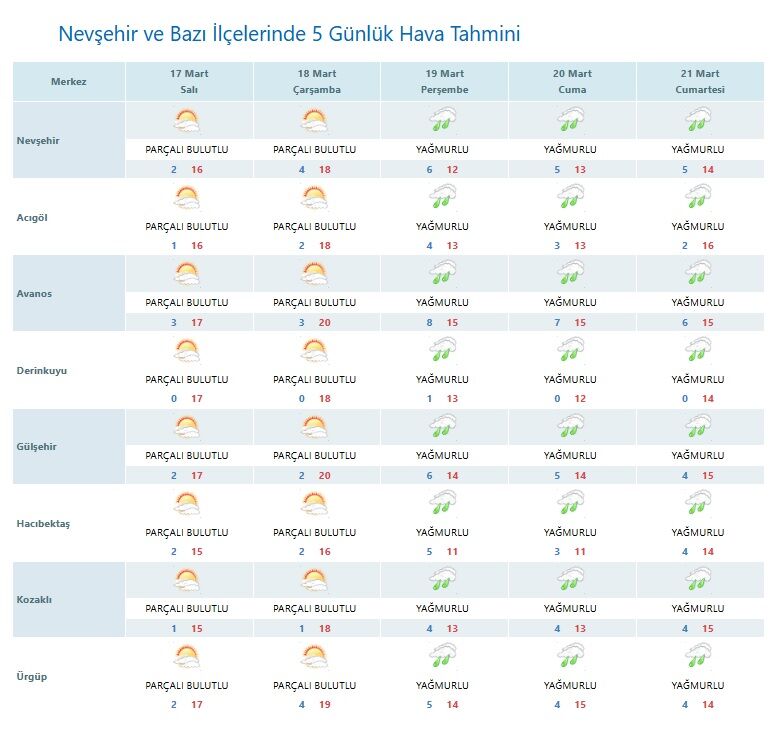 Meteoroloji verilerine göre Nevşehir merkez ve ilçelerinde 17–21 Mart tarihleri arasındaki 5 günlük hava tahminleri şöyle: